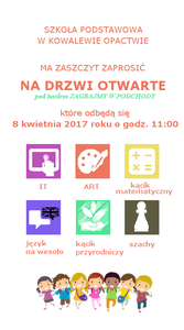 Szkoła podstawowa w Kowalewie Opactwie ma zaszczyt zaprosić Rodziców wraz z Dziećmi na DRZWI OTWARTE. Spotkanie odbędzie się 8 kwietnia 2017 roku o godzinie 11:00 w siedzibie obecnego gimnazjum. Gwarantujemy miłą zabawę i moc emocji.