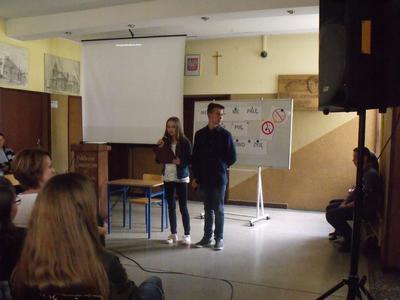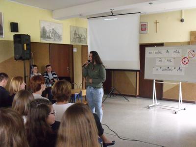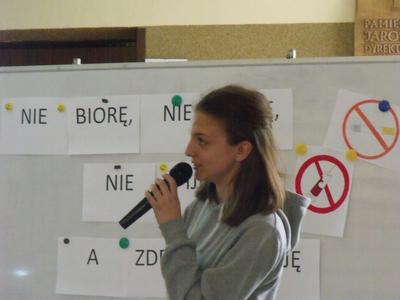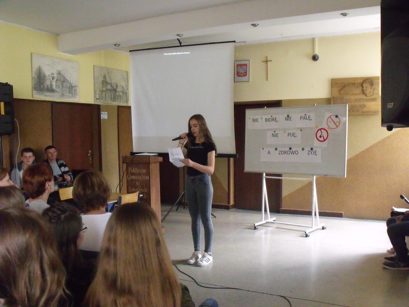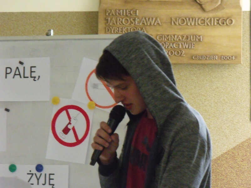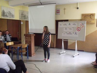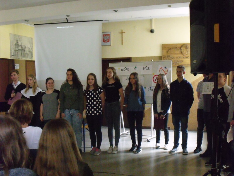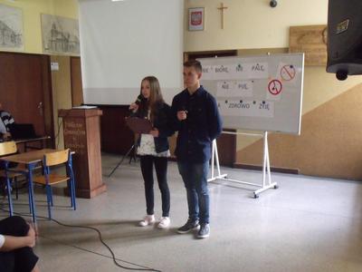 25 maja w naszej szkole odbył się Dzień Walki z Nałogami. Tematem naszego spotkania był „XXI wiek bez nałogów i uzależnień”. W tym dniu Uczniowie klas drugich i trzecich przygotowali przedstawienie. Cały występ uczniów naszego gimnazjum był podzielony na 3 części. Pierwszą część stanowiła scenka antynikotynowa. Jasiu ( Filip Drzewiecki) podczas rozmowy z koleżanką( Patrycja Szymańska) doszedł do wniosku, że "lepiej wydać pieniądze na cukiereczki zamiast na fajeczki." Kolejną częścią był list narkomanki, który przedstawiła nam Julia Gołdych. Ostatnia część była poświęcona alkoholowi. Znaleźliśmy się na sali rozpraw, w której odbyła się sprawa dotycząca oskarżenia nałogów. Głównymi oskarżonymi były takie używki jak: Narkotyki, Dopalacze, Alkohol i Papierosy, czyli w skrócie NDAP, natomiast oskarżycielami byli poszkodowani oraz ci, którzy widzieli zło wyrządzone przez NDAP-a. Po wystąpieniu ostatniego świadka Sąd uznał oskarżonego NDAP-a winnym i skazał go na likwidację. Chciejmy żyć bez nałogów!