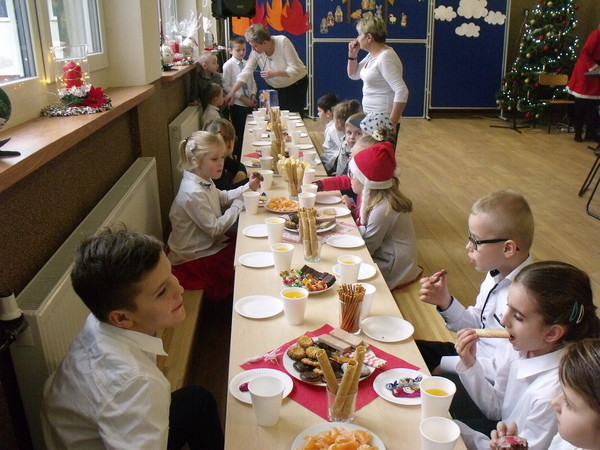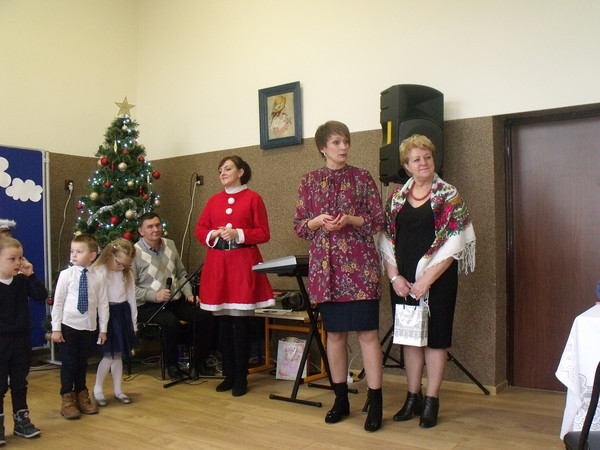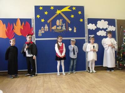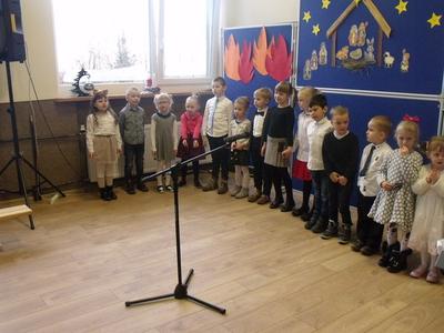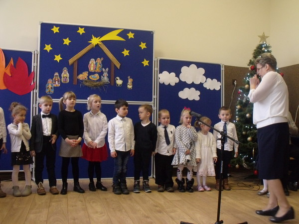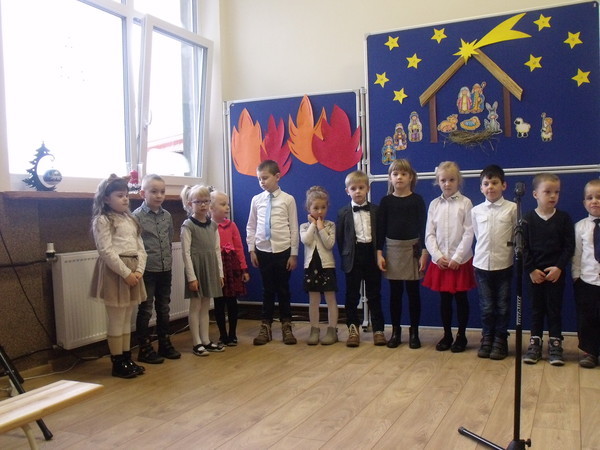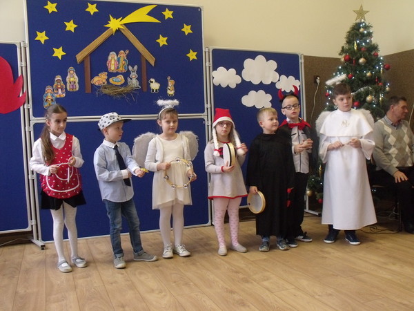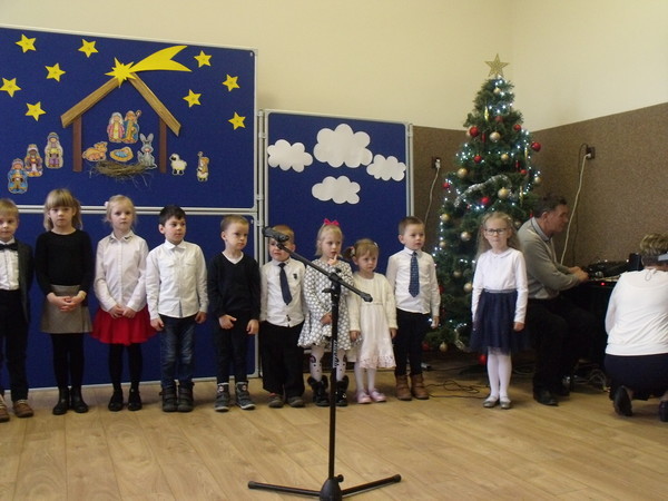 Następnie swoje umiejętności recytatorskie i artystyczne zaprezentowały przedszkolaki. Dla niektórych dzieci był to sceniczny debiut, tym bardziej musiały wykazać się niesamowita odwagą. Wszystkie maluchy zostały obdarowane gromkimi brawami. Kolejne umiejętności muzyczne oraz aktorskie ukazali uczniowie z klasy Ia. Przygotowali instrumentację (na instrumentach perkusyjnych) kolędy „Wśród nocnej ciszy” oraz przedstawienie pt: „Piekło i niebo” . Wspaniałym momentem było wspólne śpiewanie przez wszystkie dzieci kolędy „ Przybieżeli do Betlejem” oraz taniec do piosenki pt. „Czy wierzysz w magię”. Magiczna atmosfera dostarczyła oglądającym wielu pozytywnych emocji oraz wzruszeń. Na zakończenie mali aktorzy zostali obdarowani słodkościami.