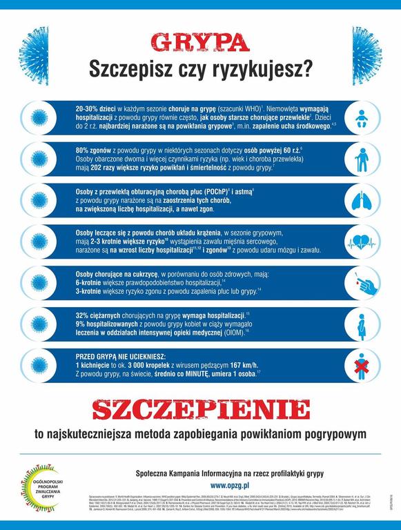 Przekazujemy przygotowane w ramach Ogólnopolskiego Programu Zwalczania Grypy (OPZG) i w ramach akcji „Zaszczep się wiedzą” materiały informacyjno-edukacyjnych do wykorzystania w działaniach informacyjnych w wersji elektronicznej: