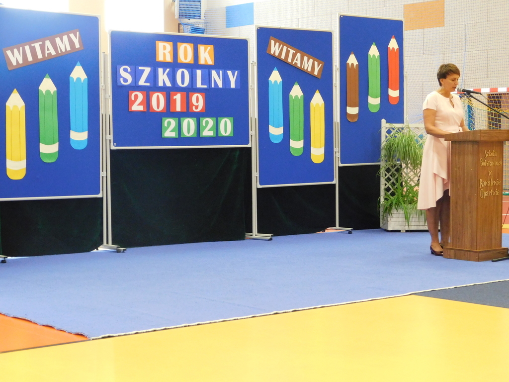 2 września rozpoczęliśmy kolejny rok szkolny w Szkole Podstawowej w Kowalewie Opactwie. Po uroczystej mszy św. uczniowie, nauczyciele, pracownicy obsługi oraz rodzice udali się do hali sportowej. Dyrektor szkoły – p. Beata Przybylska powitała bardzo serdecznie wszystkich przybyłych na tę uroczystość. Podkreśliła fakt, iż od tego roku staliśmy się pełną ośmioklasową szkoła podstawową. Przedstawiła nowych uczniów z klasy I, IV, VII oraz rozpoczynających pracę nauczycieli. Nawiązała także do 80 rocznicy wybuchu II wojny światowej, wskazując na istotę współczesnego patriotyzmu. Na zakończenie życzyła uczniom między innymi wielu sukcesów i wszechstronnego rozwoju w przyjaznej atmosferze.