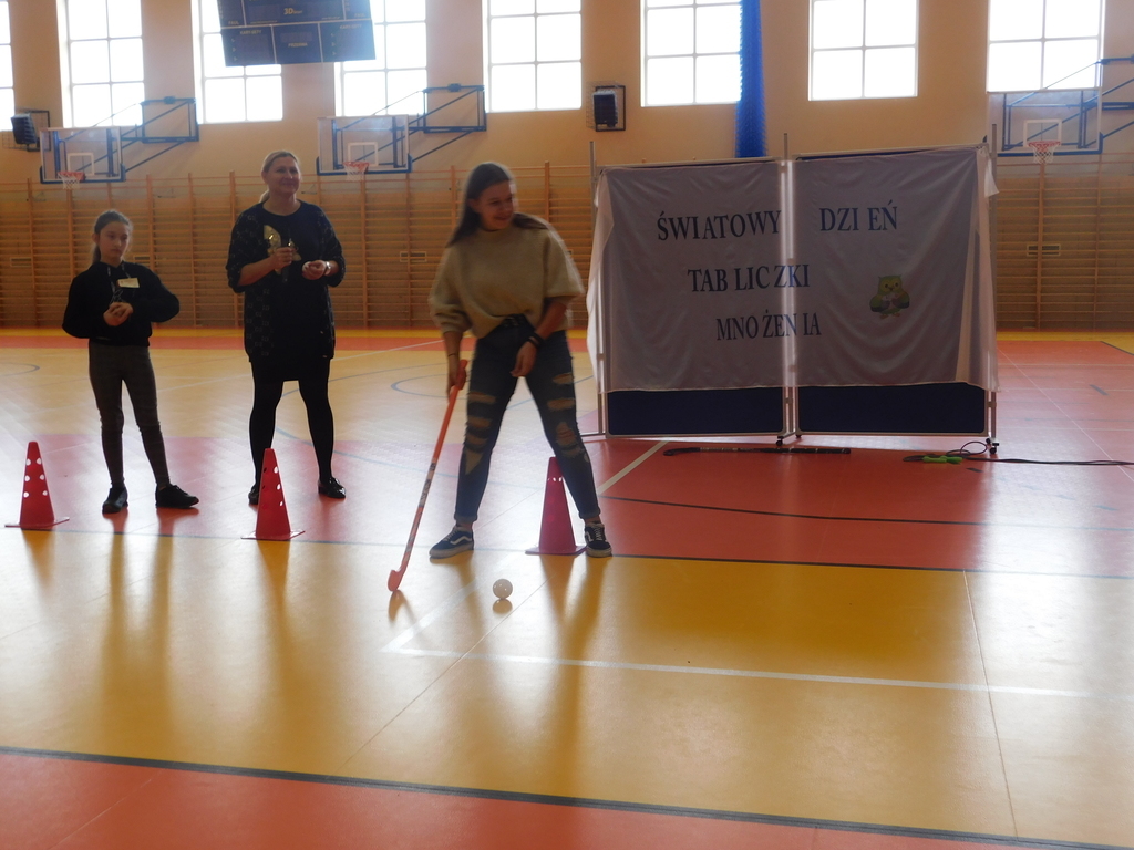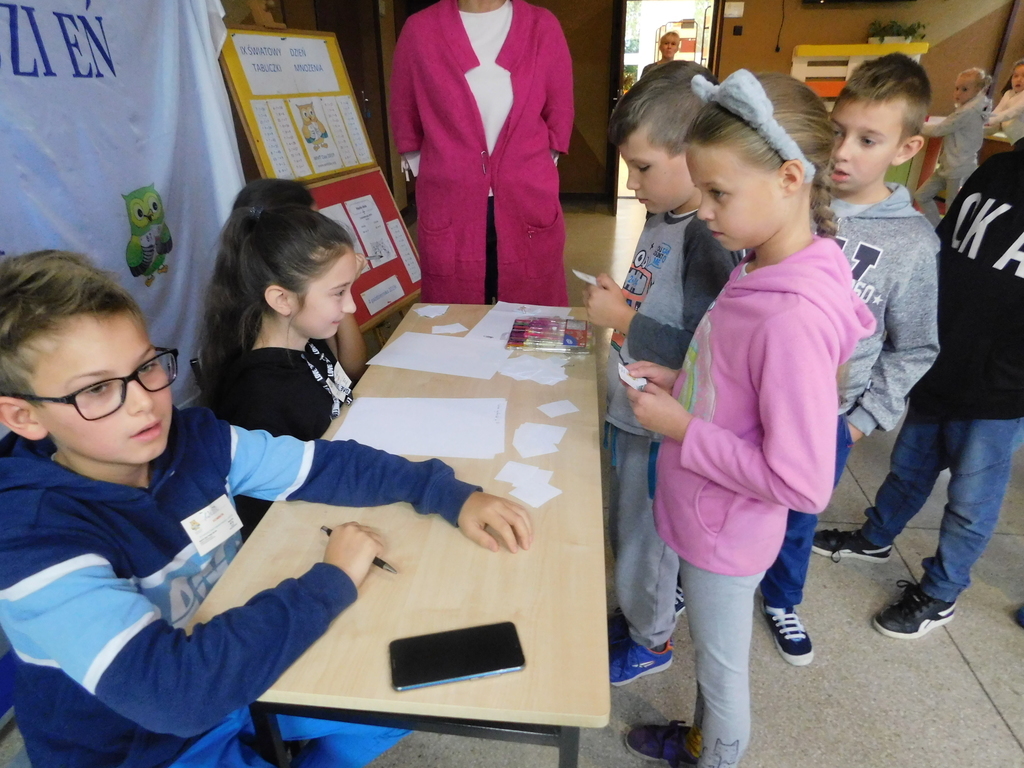 Dnia 4 października w naszej szkole odbył się IX Światowy Dzień Tabliczki Mnożenia. Akcja ta miała na celu zachęcenie wszystkich do przypomnienia sobie tabliczki mnożenia. Główne motto imprezy brzmiało: „Młodsi sprawdzają czy starsi tabliczkę mnożenia znają”. W tym roku szkolnym w rolę egzaminatorów wcielili się uczniowie z klasy 5: Katarzyna Kierkowska, Paulina Pietryga oraz Witold Wojciechowski. Tytuł Eksperta Tabliczki Mnożenia zdobyło 17 uczniów, którzy w ten sposób zakwalifikowali się do kolejnej rozgrywki, tym razem sportowej. Uczestnicy musieli znów zmierzyć się nie tylko z tabliczką mnożenia, ale także z rzutami do bramki unihokeja. Najlepszym w tej konkurencji okazał się Wiktor Pendziński z klasy 6. Wszystkim Ekspertom Tabliczki Mnożenia serdecznie gratulujemy, a egzaminatorom dziękujemy za sprawne przeprowadzenie egzaminu. Za rok ponownie przyłączamy się do akcji.