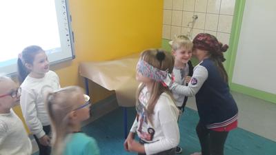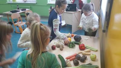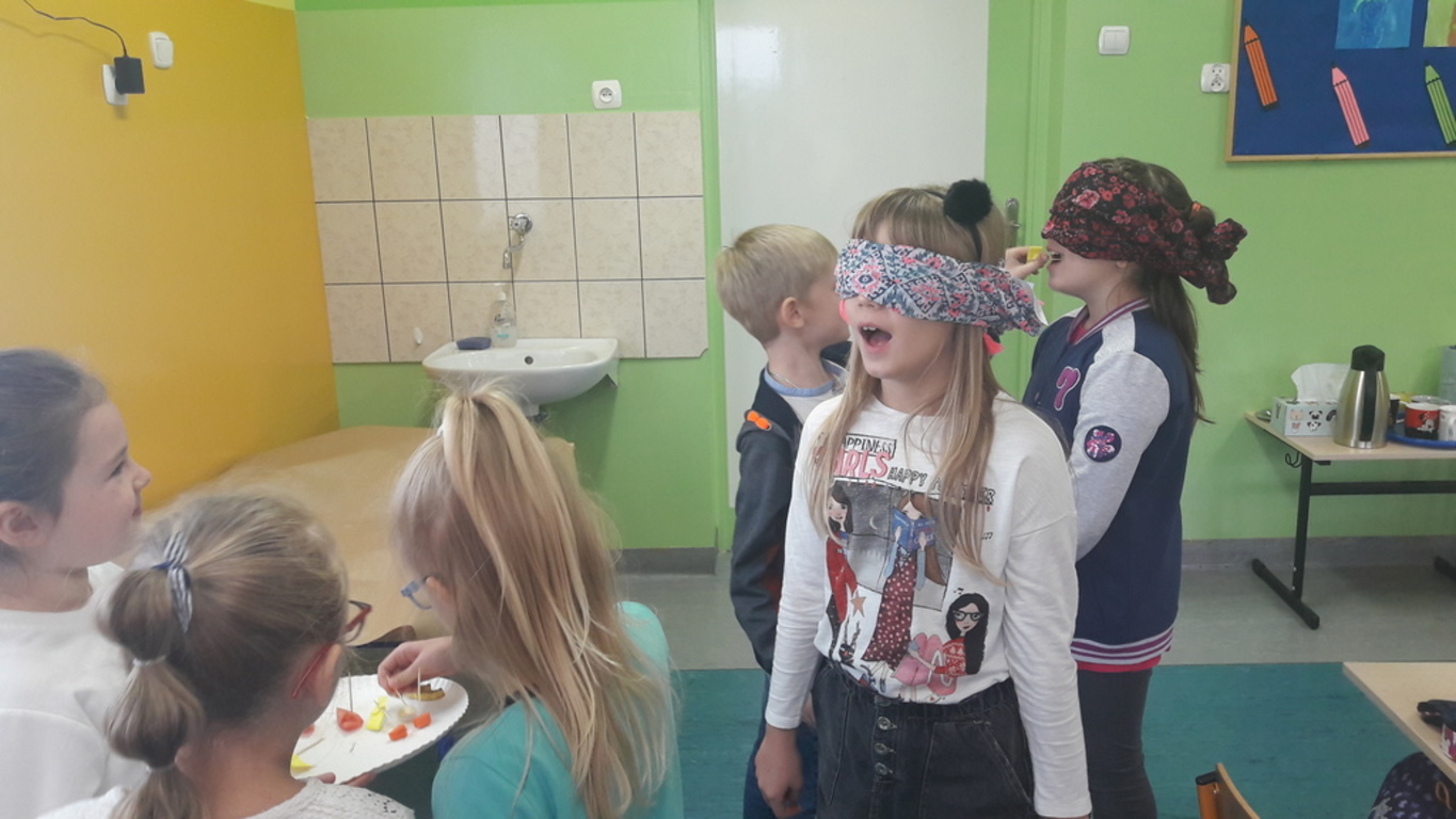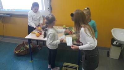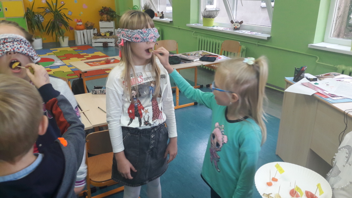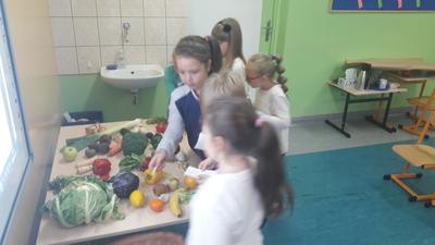 Na początku zajęć uczniowie zostali losowo podzieleni na dwie grupy. Każda z nich miała za zadanie wypisać, bądź narysować jak największą liczbę warzyw i owoców w ciągu 5 minut. Po upływie czasu podliczono punkty i wyłoniono zwycięską drużynę. Następnie uczniowie zwiedzali „wystawę” przyniesionych owoców i warzyw – oglądali je, dotykali i wąchali. Kolejno każda z grup wylosowała swojego przedstawiciela i jego asystenta. Reprezentantowi grupy zostały zawiązane oczy, a asystent częstował go kawałkiem owocu lub warzywa, oraz podawał do ręki w celu rozpoznania po dotyku. Drużyny notowały na tablicy nazwy rozpoznanych owoców i warzyw. Po weryfikacji odpowiedzi nastąpiło ogłoszenie wygranej drużyny.