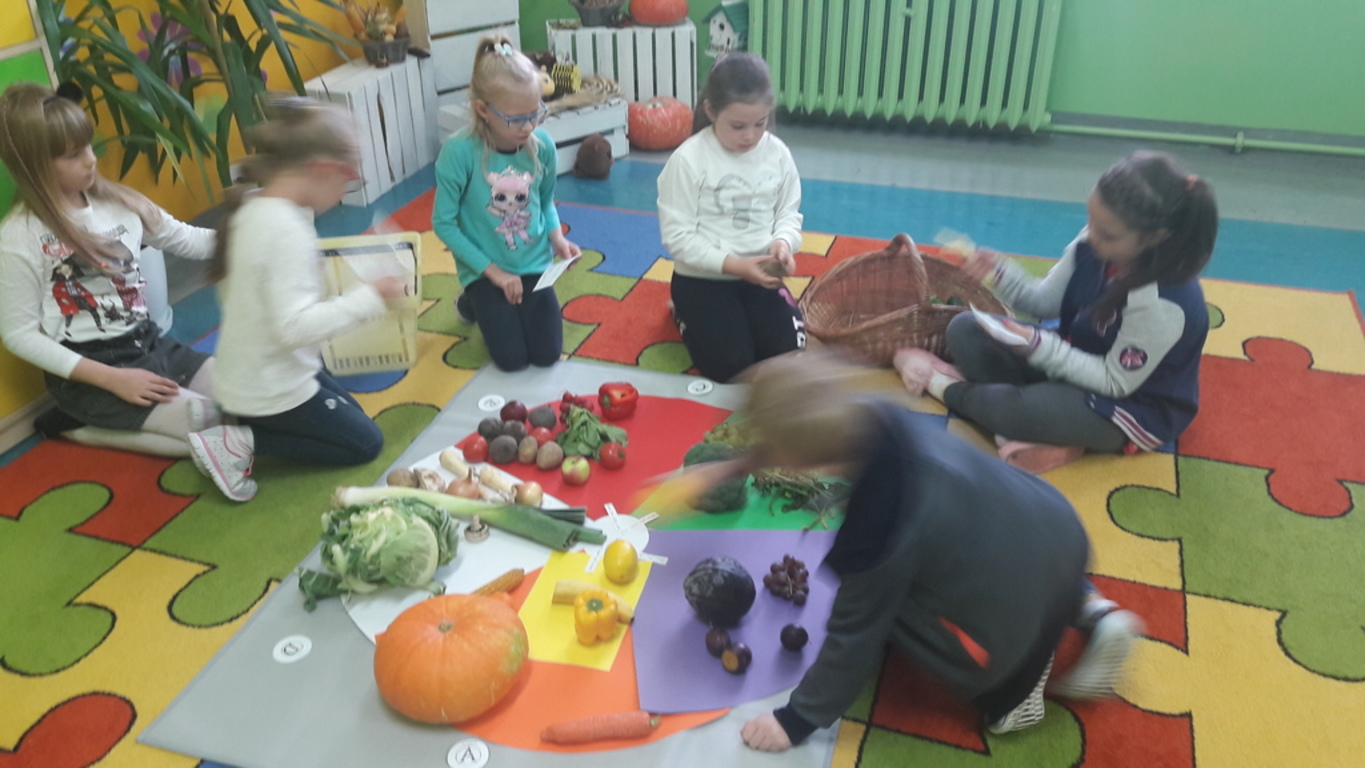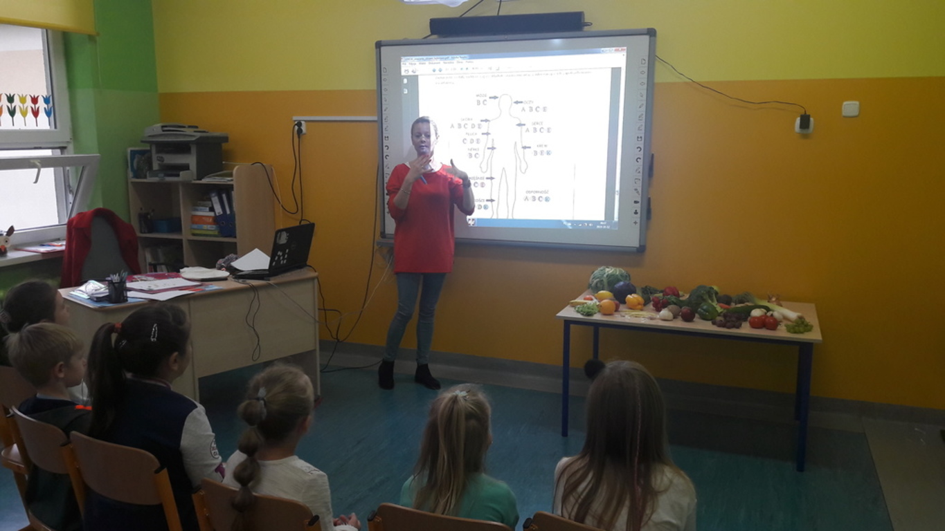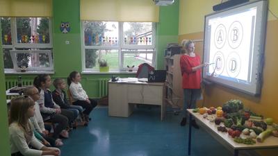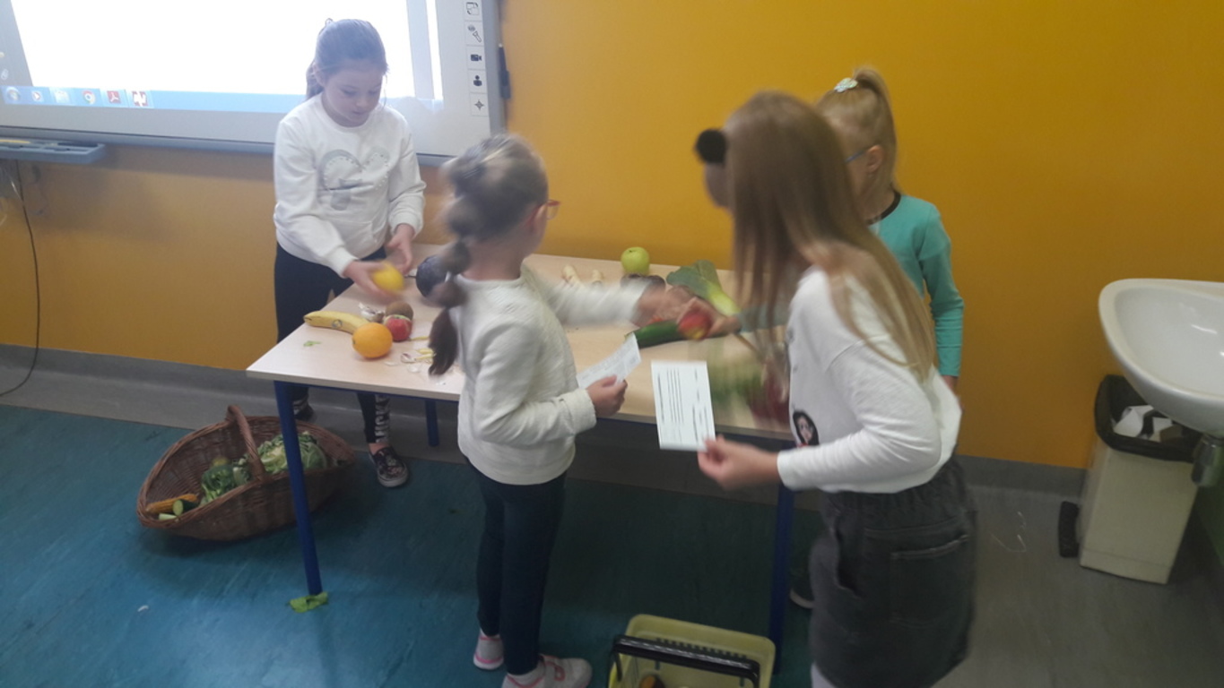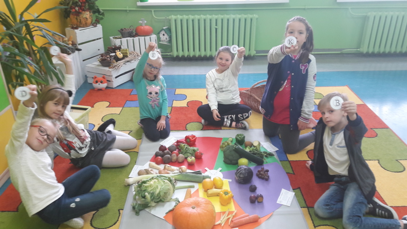 Kolejnym etapem lekcji była pogadanka z uczniami na temat wartości odżywczych owoców i warzyw oraz znajomości witamin, które się w nich znajdują. Uczniowie po dyskusji przystąpili do podziału przyniesionych owoców i warzyw na pięć grup kolorystycznych. Układali je na kolorowej planszy, oraz dopasowywali karty informacyjne o każdej grupie kolorystycznej owoców i warzyw. Nauczyciel opowiedział krótko o każdej z nich i przedstawił zalety codziennego zjadania warzyw i owoców z każdej grupy kolorystycznej. Na zakończenie zajęć wszyscy zatańczyli wesoło do piosenki pt. „Witaminki”.