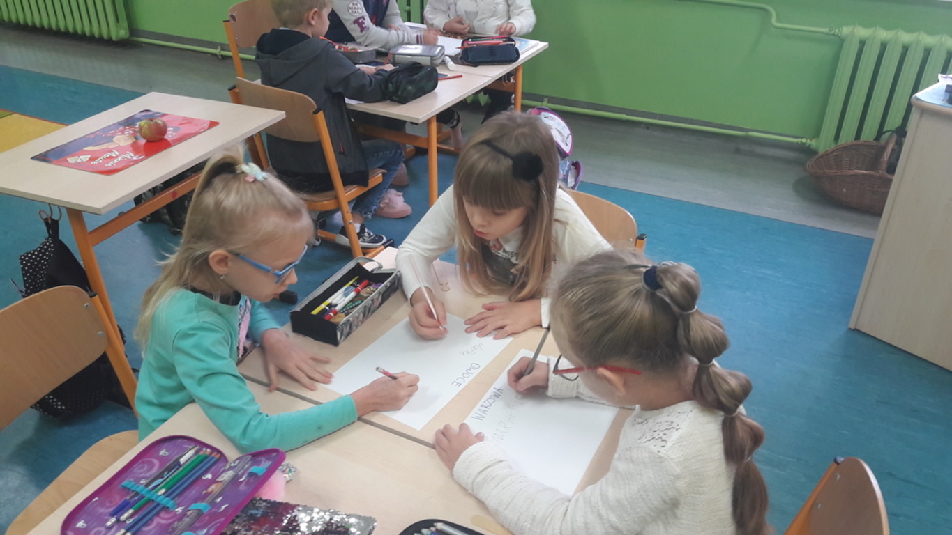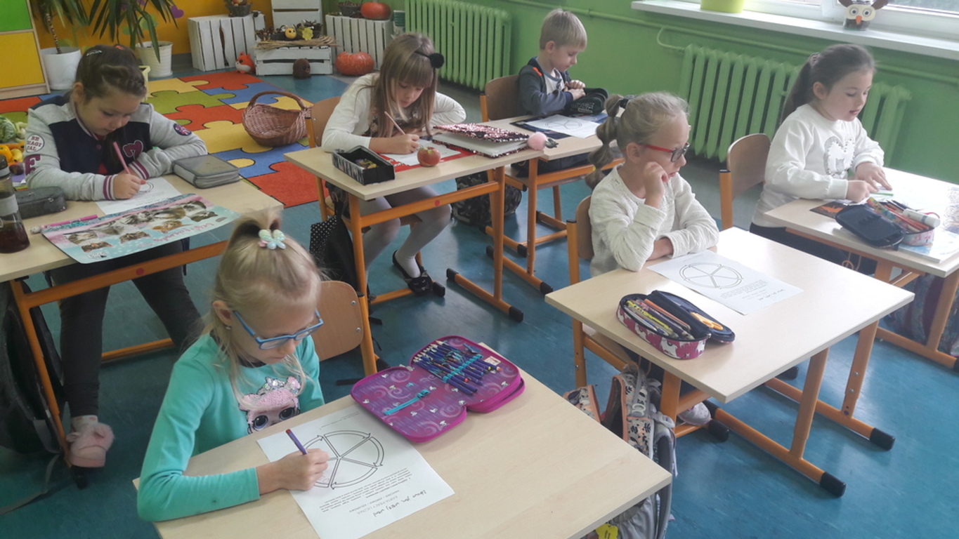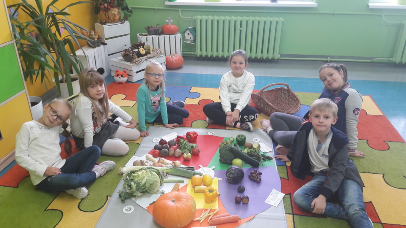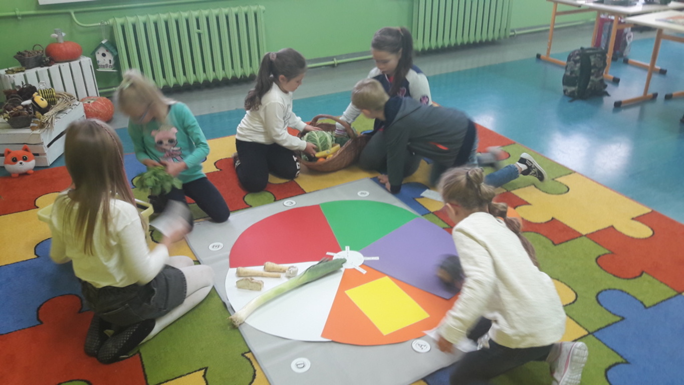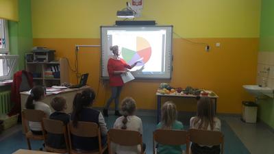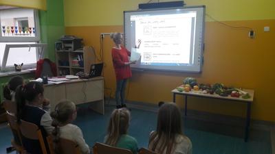Kolejnym etapem lekcji była pogadanka z uczniami na temat wartości odżywczych owoców i warzyw oraz znajomości witamin, które się w nich znajdują. Uczniowie po dyskusji przystąpili do podziału przyniesionych owoców i warzyw na pięć grup kolorystycznych. Układali je na kolorowej planszy, oraz dopasowywali karty informacyjne o każdej grupie kolorystycznej owoców i warzyw. Nauczyciel opowiedział krótko o każdej z nich i przedstawił zalety codziennego zjadania warzyw i owoców z każdej grupy kolorystycznej. Na zakończenie zajęć wszyscy zatańczyli wesoło do piosenki pt. „Witaminki”.