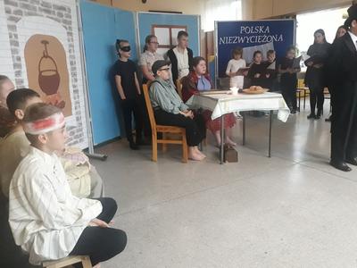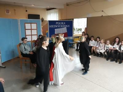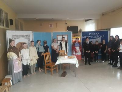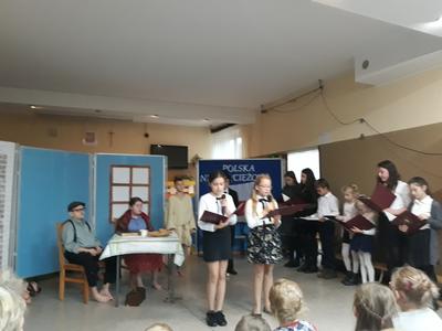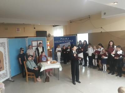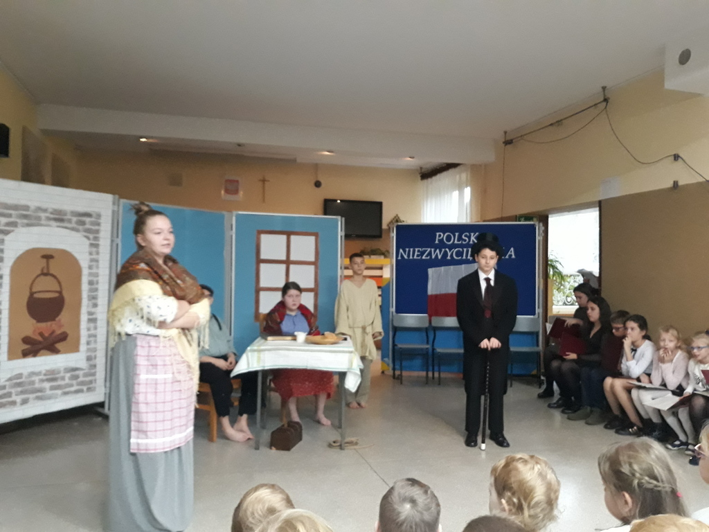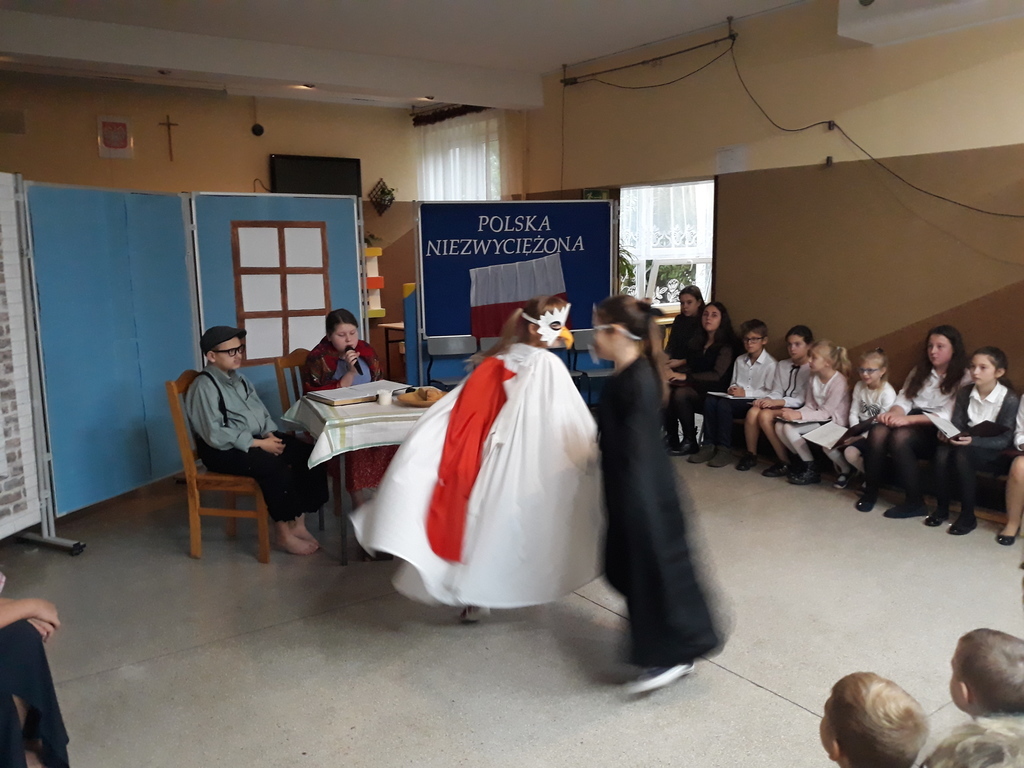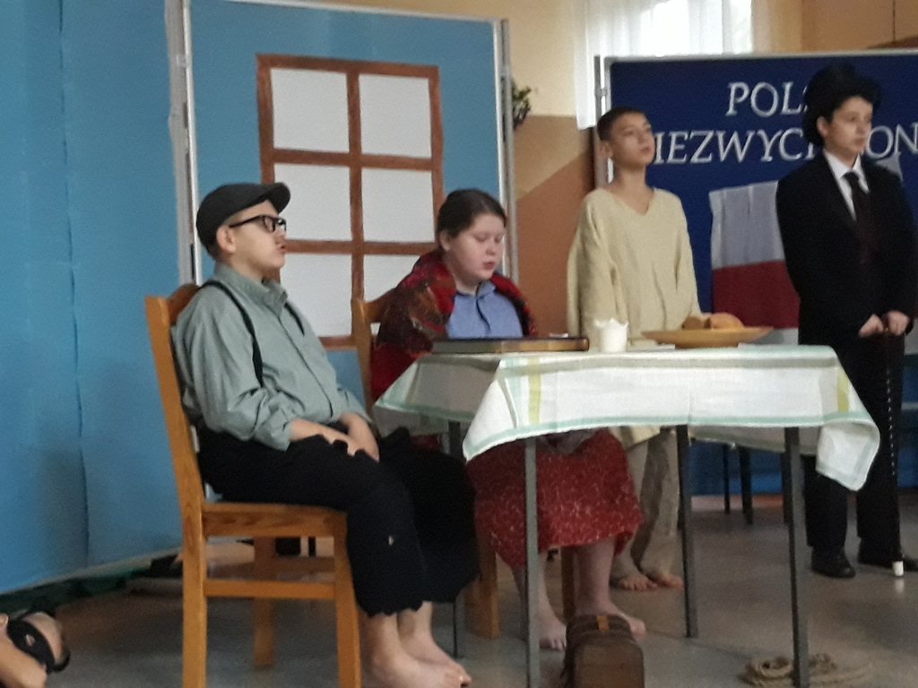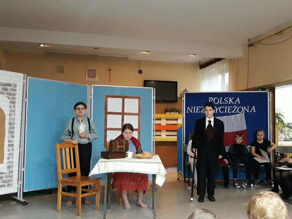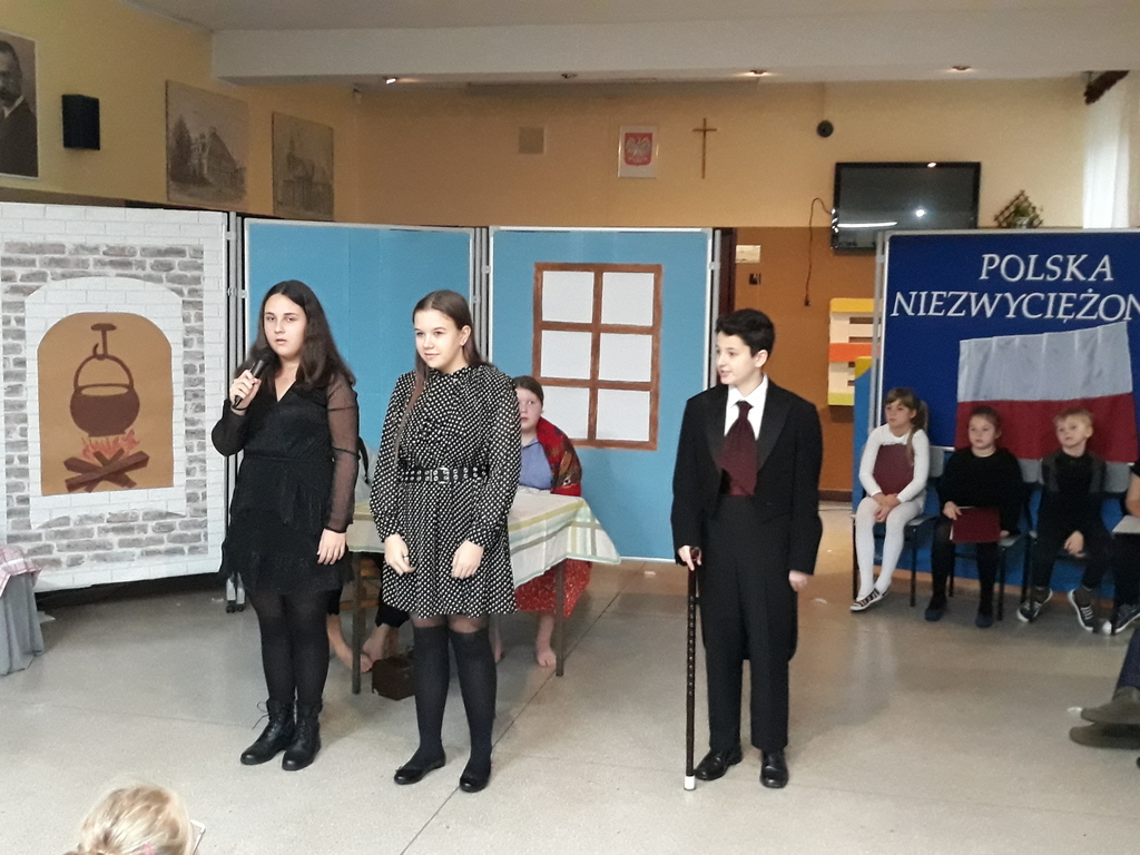 członkowie otrzymali solidne, tradycyjne wychowanie ze szczególnym naciskiem na wartości patriotyczne. Rodzina ta w czasie I wojny światowej przeżywa traumę, bo na front wyrusza i syn i ojciec, który niestety ginie ... Główni bohaterowie ukrywają w swoim domu rannego poetę, człowieka wykształconego, oczytanego i niezwykle mądrego. Częstymi odwołaniami do literatury, poezji okresu zaborów jeszcze mocniej umacniał w nich wolę walki i ofiarności za wolność najukochańszej ojczyzny. Występ młodych artystów dostarczył wszystkim zgromadzonym wielu pięknych wzruszeń, oddając atmosferę tych strasznych czasów, gdy kraj był pod zaborami. Biorąc udział w corocznych obchodach Święta Niepodległości, dajemy wyraz pamięci o naszych pradziadkach, dzięki którym żyjemy i uczymy się dzisiaj w wolnej Polsce.