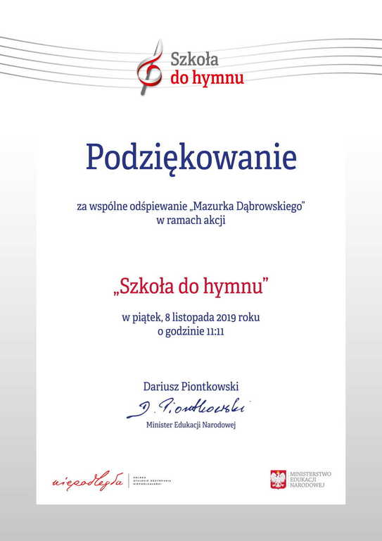 8 listopada o godz. 11:11 uczniowie naszej szkoły śpiewając hymn, oddali szacunek tym Polakom, którzy odeszli, walcząc o naszą wolność, a jednoczenie dołączyliśmy do wszystkich, którzy uczestniczyli we wspólnym śpiewie hymnu.