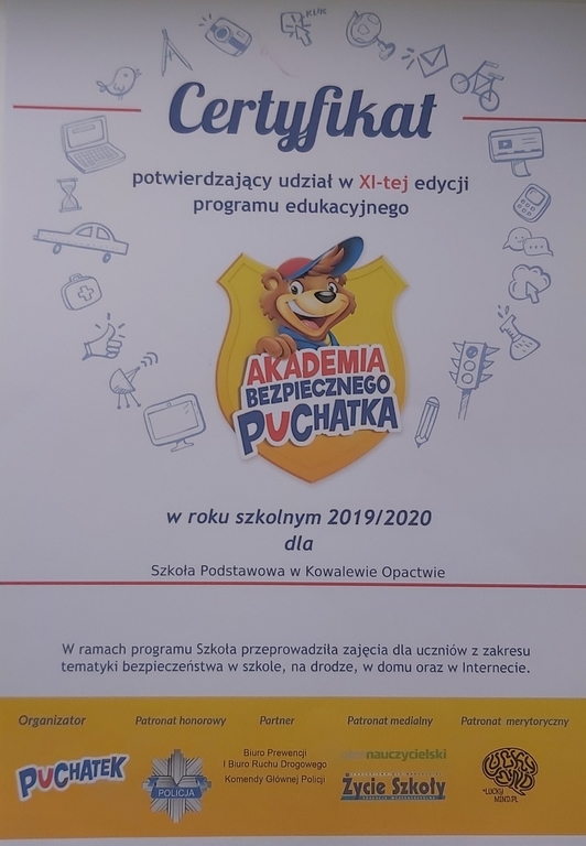 Akademia Bezpiecznego Puchatka to ogólnopolski program edukacyjny skierowany do uczniów klas I szkół podstawowych, obejmujący tematykę związaną z bezpieczeństwem dzieci w czterech sferach: na drodze, w domu, w szkole oraz w Internecie. Uczniowie klasy pierwszej brali również udział w zajęciach realizujących tematykę programu. Po przeprowadzeniu zajęć, na podstawie otrzymanych materiałów, zdobytą przez dzieci wiedzę zweryfikował Ogólnopolski Test Bezpieczeństwa, który każdy z uczniów wypełniał samodzielnie przez internet. Test wypadł znakomicie, a w nagrodę wszyscy uczniowie otrzymali dyplom, a szkoła otrzymała Certyfikat „Akademii Bezpiecznego Puchatka”.