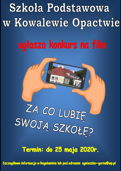 KONKURS Szkoła Podstawowa w Kowalewie Opactwie ogłasza konkurs na film "ZA CO LUBIĘ SWOJĄ SZKOŁĘ?"Regulamin konkursu w załączniku. Zdjęcia Załączniki regulamin_konkursu.pdf [274.49 kB] Zobacz również INFORMACJA DLA RODZICÓW Zapisz dziecko do Klubu Młodego Programisty online INFORMACJA DLA RODZICÓW KONKURS Wyniki konkursu ZDROWO JEM, WIĘCEJ WIEM – etap... HARMONOGRAM REKRUTACJI DO SZKÓŁ PONADPODSTAWOWYCH... 15 maja 2020 Aktualności Wydrukuj Udostępnij Wyświetlono: 402