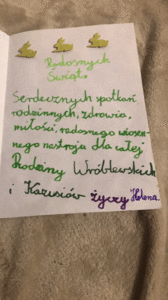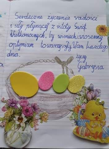 Nasi najmłodsi uczniowie przygotowali już kartki świąteczne, liczne dekoracje oraz wychodowali rzeżuche. Pragną również złożyć wszystkim życzenia świąteczne: Wesołego zajączka, co po stole bryka. Smacznościami wypełnionymi, Świątecznego koszyka. Smacznego jajka, mokrego dyngusa. Radości płynącej, ze Zmartwychwstania Jezusa Chrystusa. Pogody ducha oraz niezapomnianych chwil, spędzonych przy wspólnym stole z najbliższą rodziną. Spokojnych Świąt Wielkanocnych Życzą uczniowie klas I-III