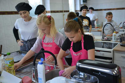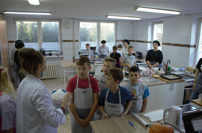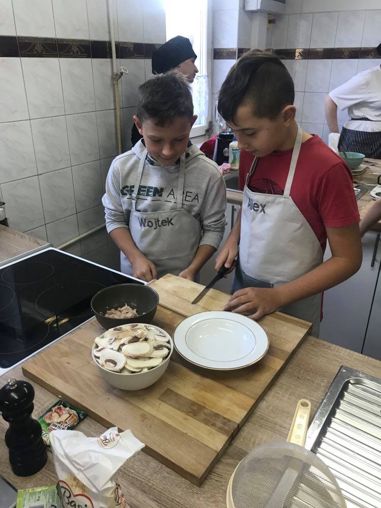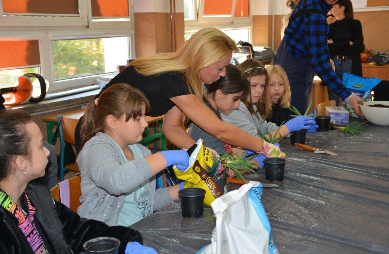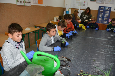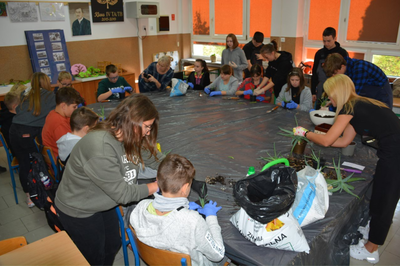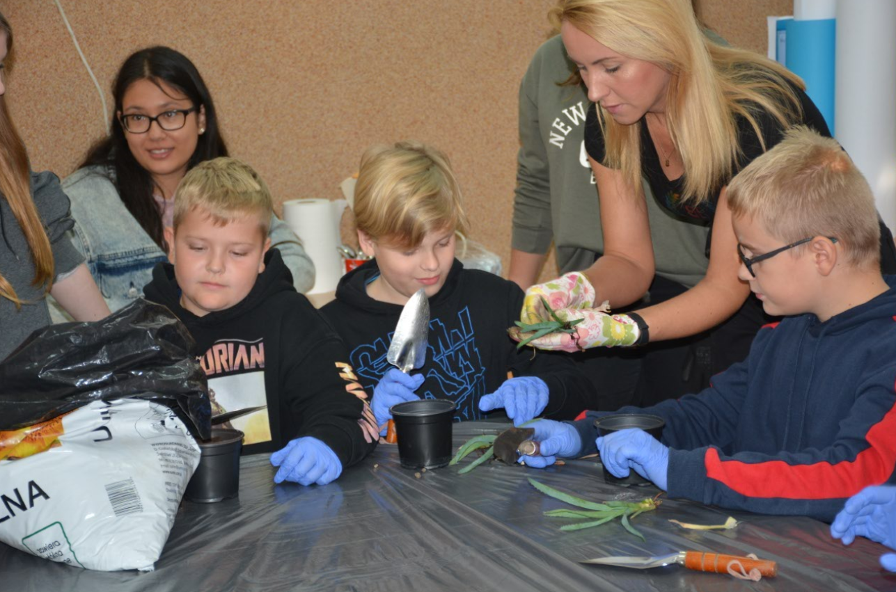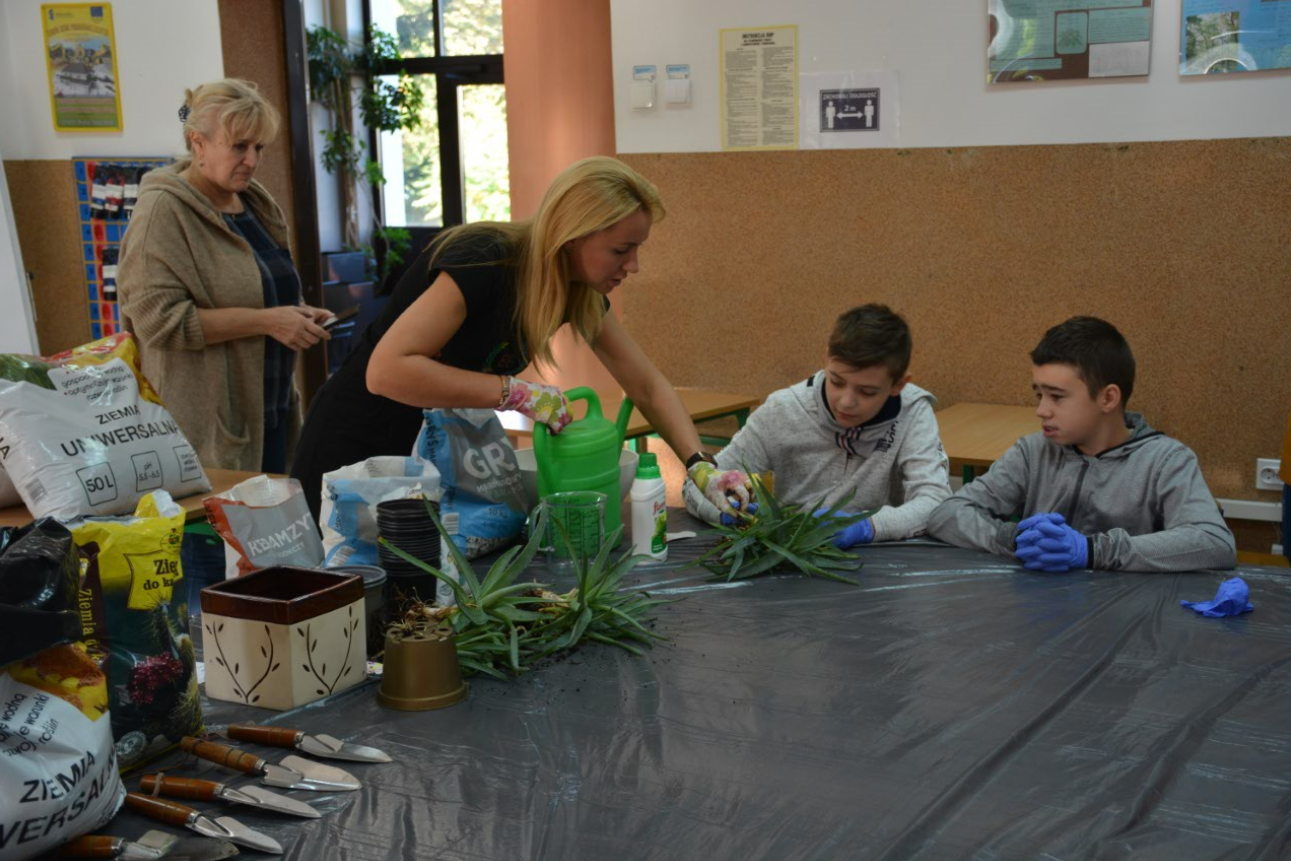 Uczniowie klasy IV pod okiem p. Jolanty Swat uczestniczyli w warsztatach kulinarnych, gdzie odkrywali tajniki kuchni, przygotowując pizzę. Z małą pomocą asystentek – uczennic Technikum Żywienia i Usług Gastronomicznych – nasi czwartoklasiści wg przepisu przygotowali i zarobili ciasto, a następnie upiekli pizzę ze swoimi ulubionymi dodatkami. Pizza była przepyszna, a swoim daniem podzielili się ze starszymi kolegami. Natomiast uczniowie z klasy V i VI brali udział w zajęciach z pielęgnacji roślin, które prowadziła p. Urszula Ławniczak oraz w warsztatach językowych prowadzonych przez p. Joannę Adamską. W czasie zajęć piąto – i szóstoklasiści dowiedzieli się, w jaki sposób rozmnożyć i przesadzić roślinę zgodnie ze sztuką ogrodniczą, a także sporządzić ciecz nawozową w odpowiedniej dawce. Czy u młodych ogrodników udało się zaszczepić pasję do uprawy roślin? Z pewnością się dowiemy, bowiem z zajęć zabrali własnoręcznie posadzone młode roślinki, które obiecali pielęgnować w domu. Wzbogacili także kompetencje językowe po angielsku, ponieważ nauczyciel anglista przeprowadził ciekawą lekcję o uprawie roślin.