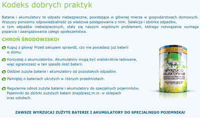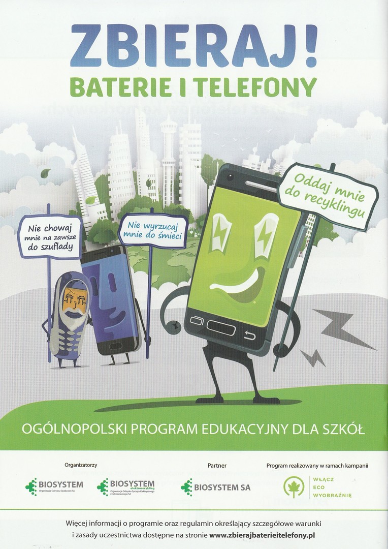Mając świadomość jak ważna jest edukacja ekologiczna dzieci i młodzieży, nasza szkoła przystąpiła do Ogólnopolskiego Programu Edukacyjnego dla Szkół "ZBIERAJ BATERIE I TELEFONY!". Jest to długofalowy program edukacyjny na temat prawidłowego pozbywania się zużytych baterii i telefonów komórkowych. Program inicjuje szereg wartościowych działań, mających na celu zapoznanie dzieci i młodzieży z wybranymi problemami z zakresu ochrony środowiska naturalnego, a poprzez praktyczne działania oraz systematyczną edukację ekologiczną zachęca do właściwego postępowania z odpadami niebezpiecznymi oraz przekonuje do przyjaznych środowisku naturalnemu postaw i nawyków. Organizatorami programu są Biosystem Organizacja Odzysku Opakowań S.A. oraz Biosystem Electrorecykling S.A. które działając w branży ochrony środowiska i gospodarki odpadami, inwestuje również w przedsięwzięcia mające na celu wzrost świadomości ekologicznej konsumentów oraz promowanie zasad selektywnego pozbywania się odpadów.