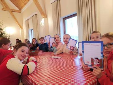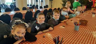 Jako pierwszą odwiedziliśmy chatkę Św. Mikołaja, po której oprowadziła nas Jego żona. Niestety nie znaleźliśmy w niej Mikołaja, więc szukaliśmy dalej. Elfy zaprowadziły nas do swojej pracowni, gdzie mogliśmy zobaczyć, jak dużo pracy na nich czeka przed świętami- muszą spakować wszystkie prezenty dla dzieci. Każdy z niecierpliwością czekał na moment, w którym napisze swój list do Świętego Mikołaja. Elfy wskazały właściwą drogę i udaliśmy się na salę, na której czekał na nas wesoły bałwanek. Wszyscy otrzymali specjalne karty oraz koperty, na których zapisywaliśmy nasze prośby i marzenia. W tym dniu mieliśmy również możliwość wykazania swoich umiejętności kulinarnych. Przygotowaliśmy piękne i smaczne pierniczki, które mogliśmy skosztować razem z gorącą czekoladą, herbatką i rogalikiem. Nieoczekiwanie odwiedził nas Św. Mikołaj, w którego towarzystwie doskonale się bawiliśmy. Tego dnia nie mogło zabraknąć wspólnego kolędowania. Na zakończenie udaliśmy się z Elfami do chatki, by wysłać nasze listy Pocztą Świętego Mikołaja. Opuszczając to niezwykłe miejsce, nie mogliśmy przejść obojętnie obok jarmarku świątecznych pamiątek. Każdy zakupił dla siebie i swoich bliskich drobny upominek.