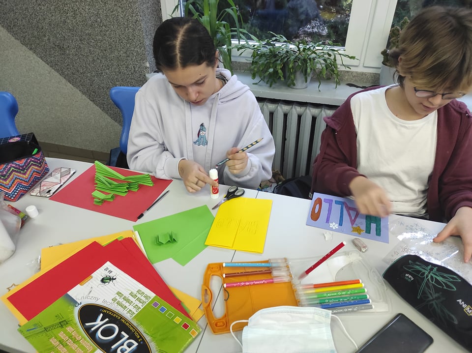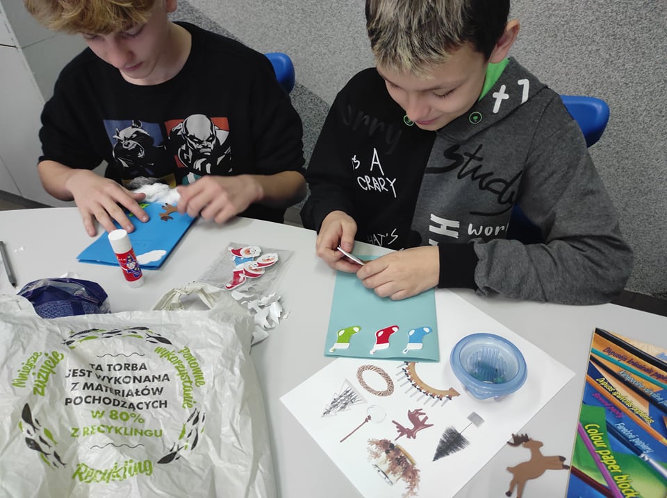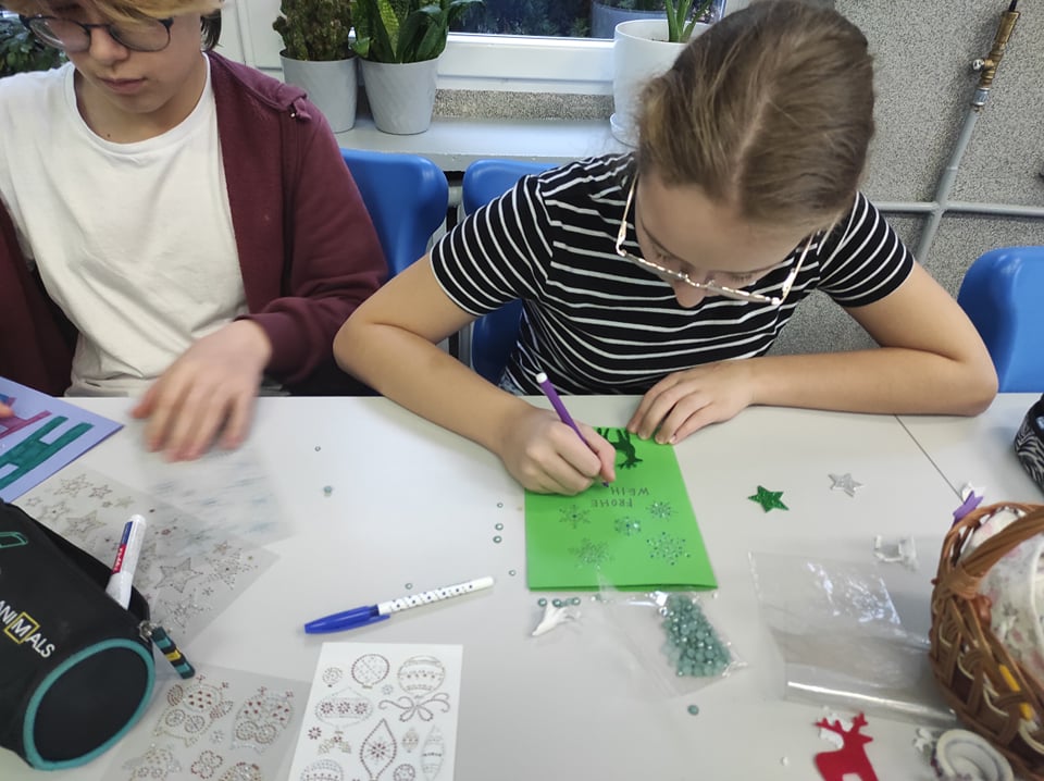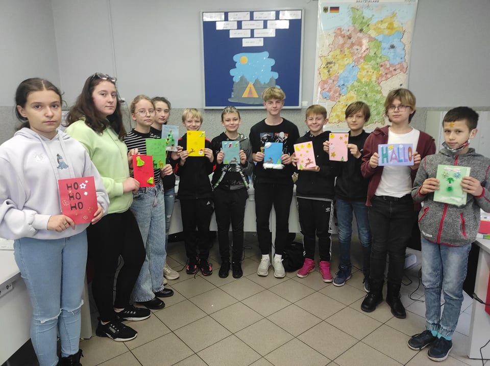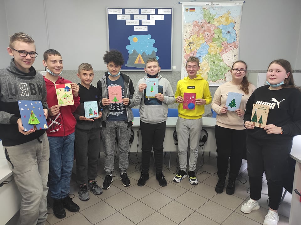 Wielkimi krokami zbliżają się Święta Bożego Narodzenia. To czas składania sobie życzeń, czy to osobiście, czy też pisząc tradycyjne kartki świąteczne. Uczniowie klasy VII i VIII wzięli udział w projekcie „Austausch von Weihnachtskarten” - wymiana kartek świątecznych”, który polegał na wykonaniu kartek z tradycyjnymi życzeniami w języku niemieckim. Kartki zostały wysłane za granicę do szkół, do urzędu kanclerskiego w Niemczech oraz do Księstwa Liechtensteinu. Z niecierpliwością czekamy na kartki z życzeniami dla nas.