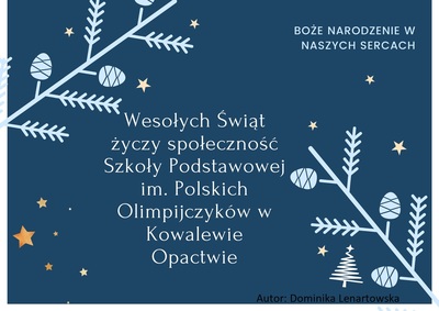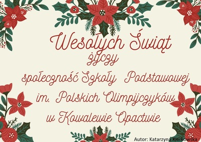 Z ogromną przyjemnością ogłaszamy wyniki konkursu na najpiękniejszą kartkę świąteczną. W tym roku najbardziej zachwyciły nas kartki wykonane przez uczniów: Katarzynę Kierkowską z klasy VII, Eryka Matuszczaka z klasy VI oraz Dominikę Lenartowską z klasy VIII. Prace uczniów zostaną wysyłane jako życzenia z naszej szkoły. Serdecznie dziękujemy wszystkim uczestnikom za piękne prace, zaangażowanie, pomysłowość i kreatywność.