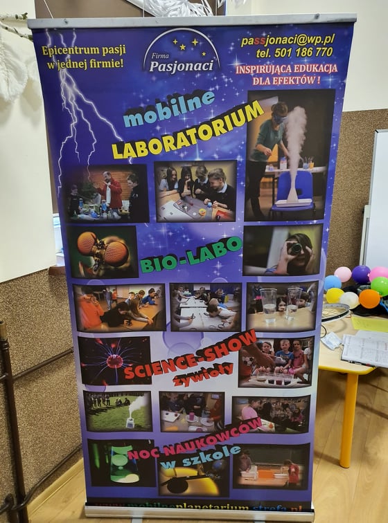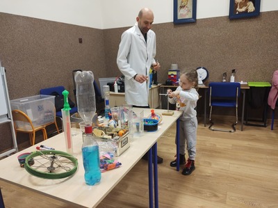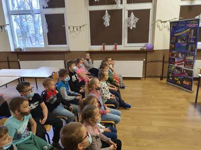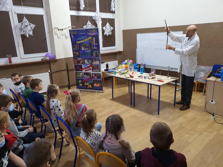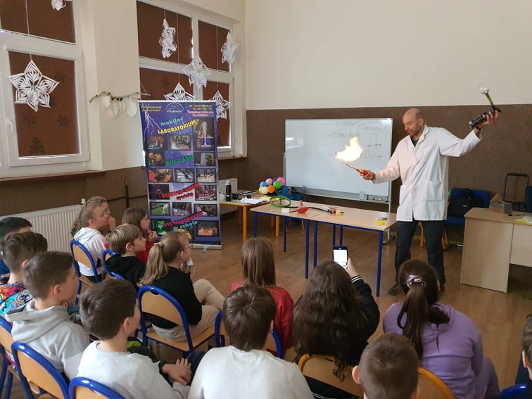 Przedszkolaki oraz uczniowie klas I – IV wzięli dziś udział w niecodziennych zajęciach. Naszą szkołę odwiedził niezwykły człowiek – pan Robert Przybylski z firmy Pasjonaci, który ze swoim laboratorium w bardzo widowiskowy sposób przybliżył dzieciom trudne zagadnienia z fizyki oraz chemii. Dzieci były wprost zachwycone i z wielkim zainteresowaniem obserwowały wszystkie pokazy. Warsztaty miały formę zajęć praktycznych, w czasie których młodzi naukowcy sami wykonywali eksperymenty i doświadczenia. Zajęcia były bardzo fascynujące i wszystkich zachwyciły. Z pewnością udział w żywej lekcji rozbudził wśród uczniów zainteresowanie przedmiotami przyrodniczymi.