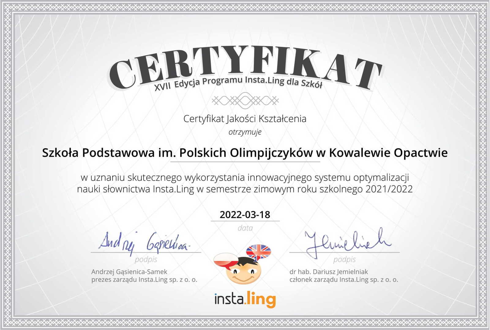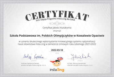 Certyfikaty dla szkół za XVII edycję w programie Instaling zostały wystawione, dlatego chcielibyśmy serdecznie pogratulować wszystkim Uczniom, którzy aktywnie zaangażowali się w pracę z Programem. Nasza szkoła otrzymała certyfikat za spełnienie wszystkich warunków w ramach zajęć z języka angielskiego i języka niemieckiego.
