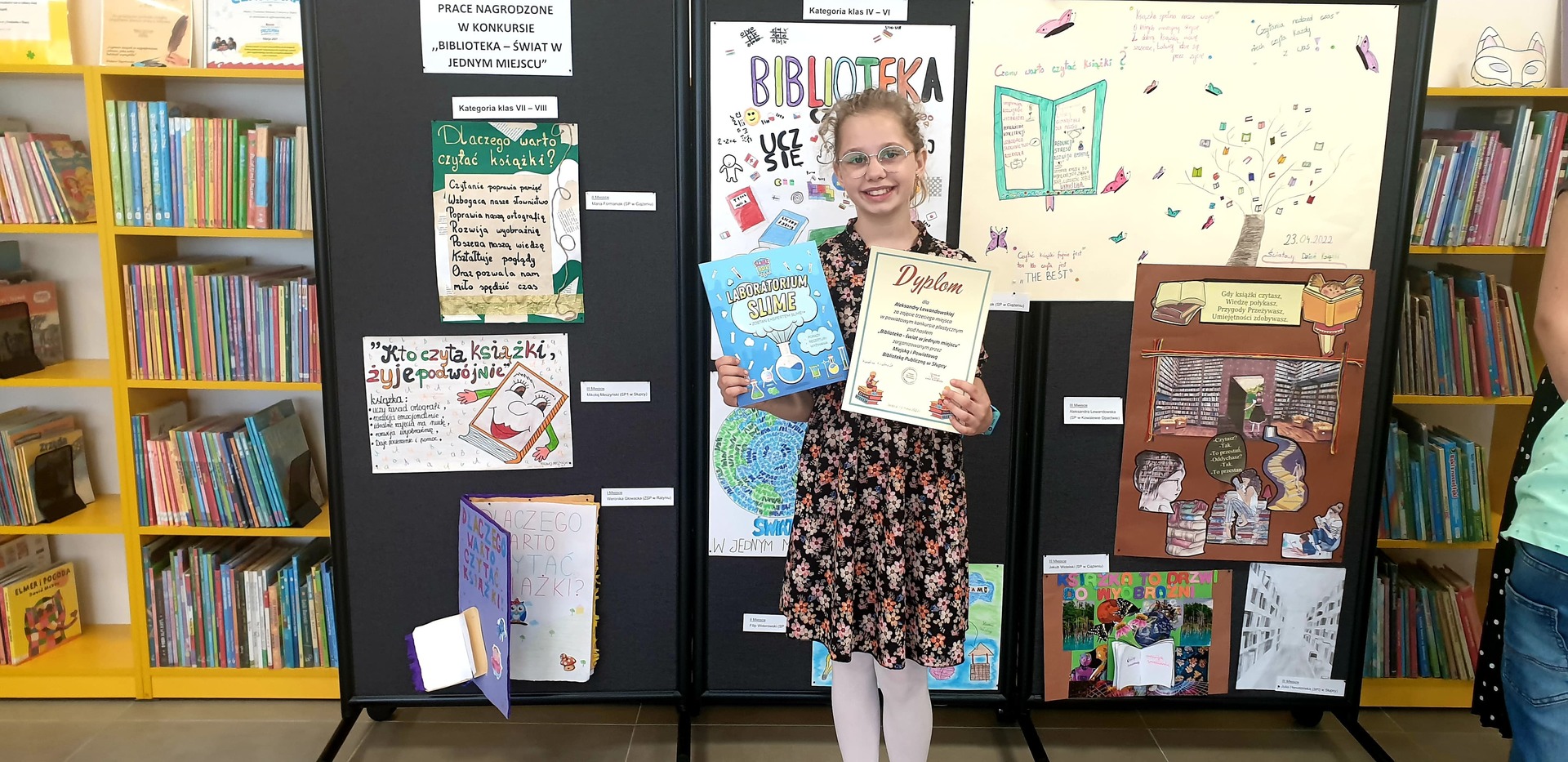 "Biblioteka - świat w jednym miejscu" - to powiatowy konkurs plastyczny przygotowany i przeprowadzony przez Miejską i Powiatową Bibliotekę Publiczną w Słupcy, w którym III miejsce zajęła Aleksandra Lewandowska, uczennica naszej szkoły, uczęszczająca do klasy IV.