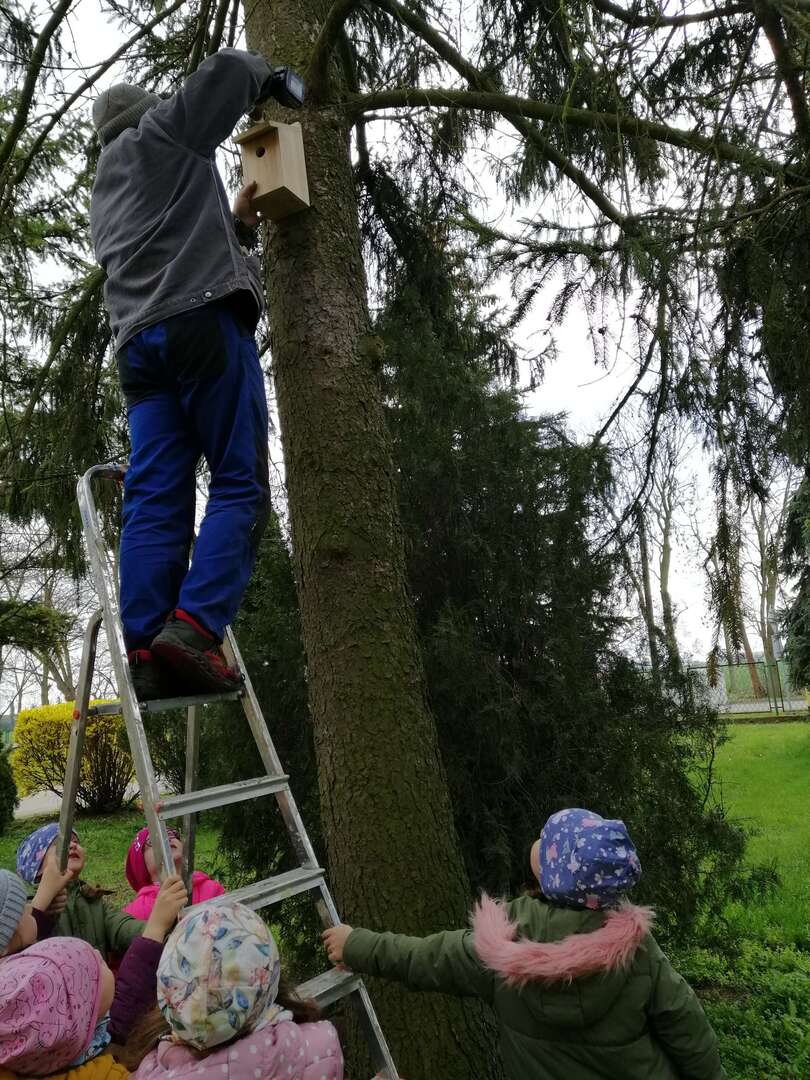 Nasze przedszkolaki wraz z pomocą Pana Tomasza wybrały drzewa na których umieszczono budki lęgowe. Przedszkolaki czekają na lokatorów, których będą mogły obserwować i poznawać ich zwyczaje. Budki podarował nam Urząd Gminy Słupca. Przedszkolaki serdecznie dziękują.