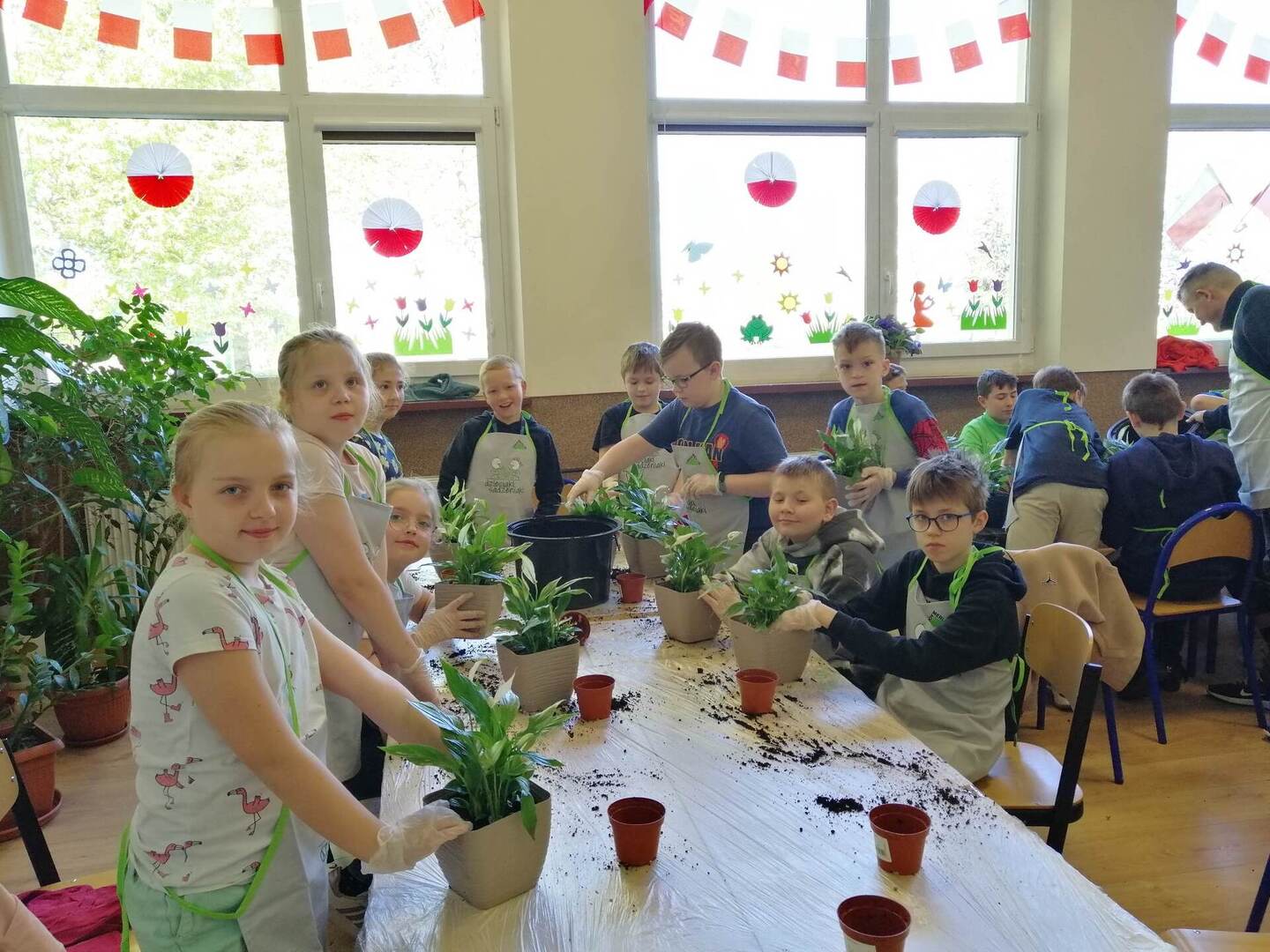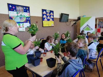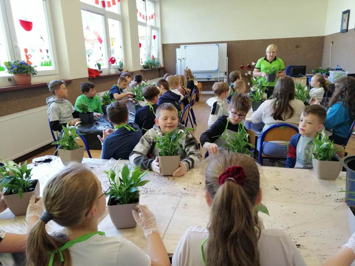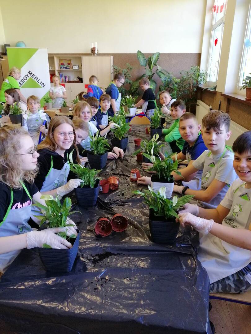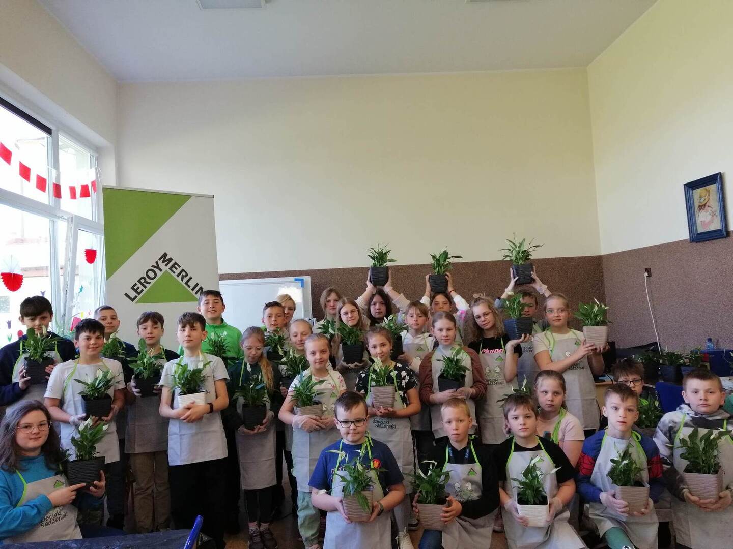 W dniu dzisiejszym uczniowie klasy III, IV oraz V wzięli udział w projekcie zorganizowanym przez Leroy Merlin. Warsztaty te polegały na edukacji pielęgnacji i sadzenia roślin doniczkowych. Zadaniem uczniów było wsadzenie Skrzydłokwiatu. Jest to piękna roślina zielona, która pochłania metale ciężkie, które emitują telewizory, tablety a także telefony komórkowe. Uczniowie poznali wiele istotnych ciekawostek dotyczących pielęgnacji roślin. Serdecznie dziękujemy firmie Leroy Merlin za zorganizowanie warsztatów dla naszych podopiecznych.