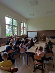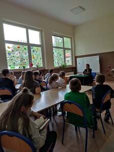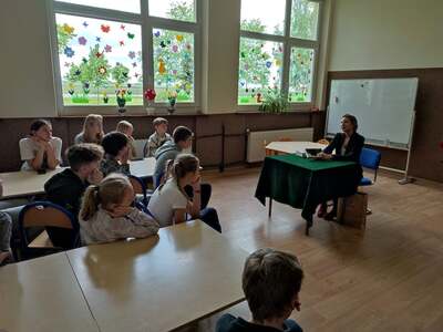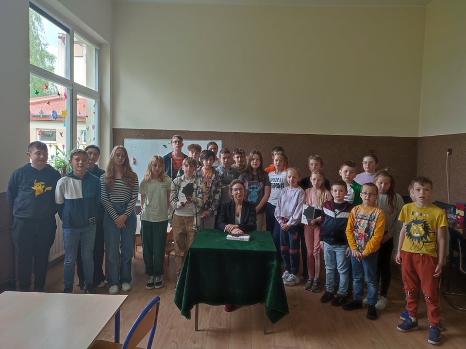Spotkanie przebiegało w bardzo miłej atmosferze. Pani Bączkiewicz opowiedziała uczniom, jak wyglądała jej praca nad książką, skąd czerpała inspiracje oraz co to są prawa autorskie i czego dotyczą. Dzieci zadawały też pytania dotyczące powstawania utworu i życia prywatnego.