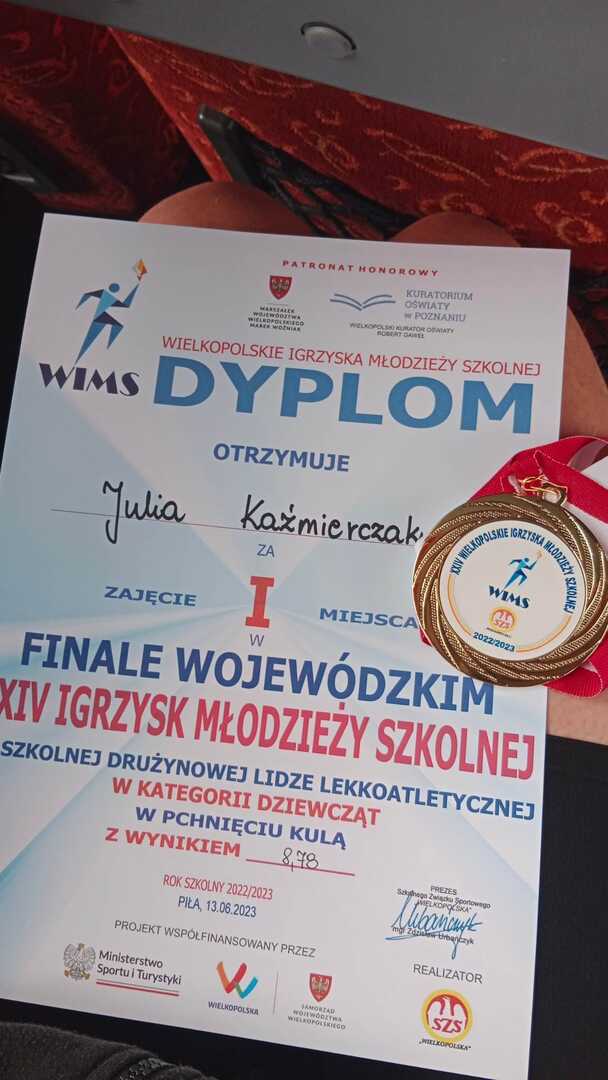 13 czerwca w Pile odbyły się Mistrzostwa Województwa Wielkopolskiego w Szkolnej Lidze Lekkoatletycznej w ramach Igrzysk Młodzieży Szkolnej. Naszą szkołę w konkurencji ,,pchnięcie kulą" reprezentowała Mistrzyni Powiatu Słupeckiego Julia Kaźmierczak. I podobnie jak w zawodach powiatowych Julka okazała się bezkonkurencyjna i z wynikiem 8,78 została Mistrzynią Województwa Wielkopolskiego.