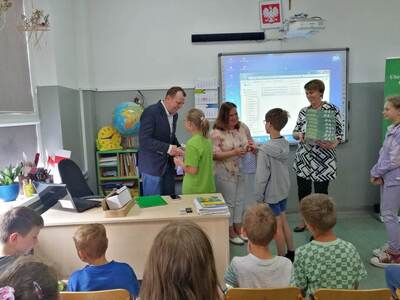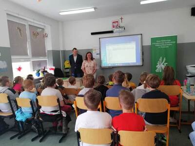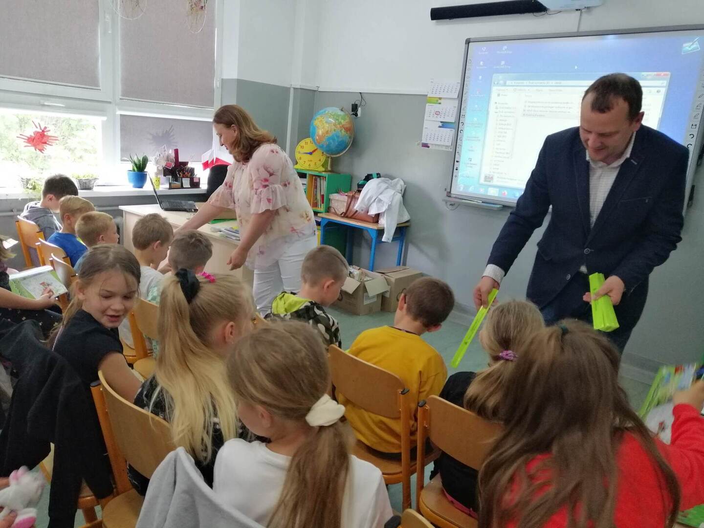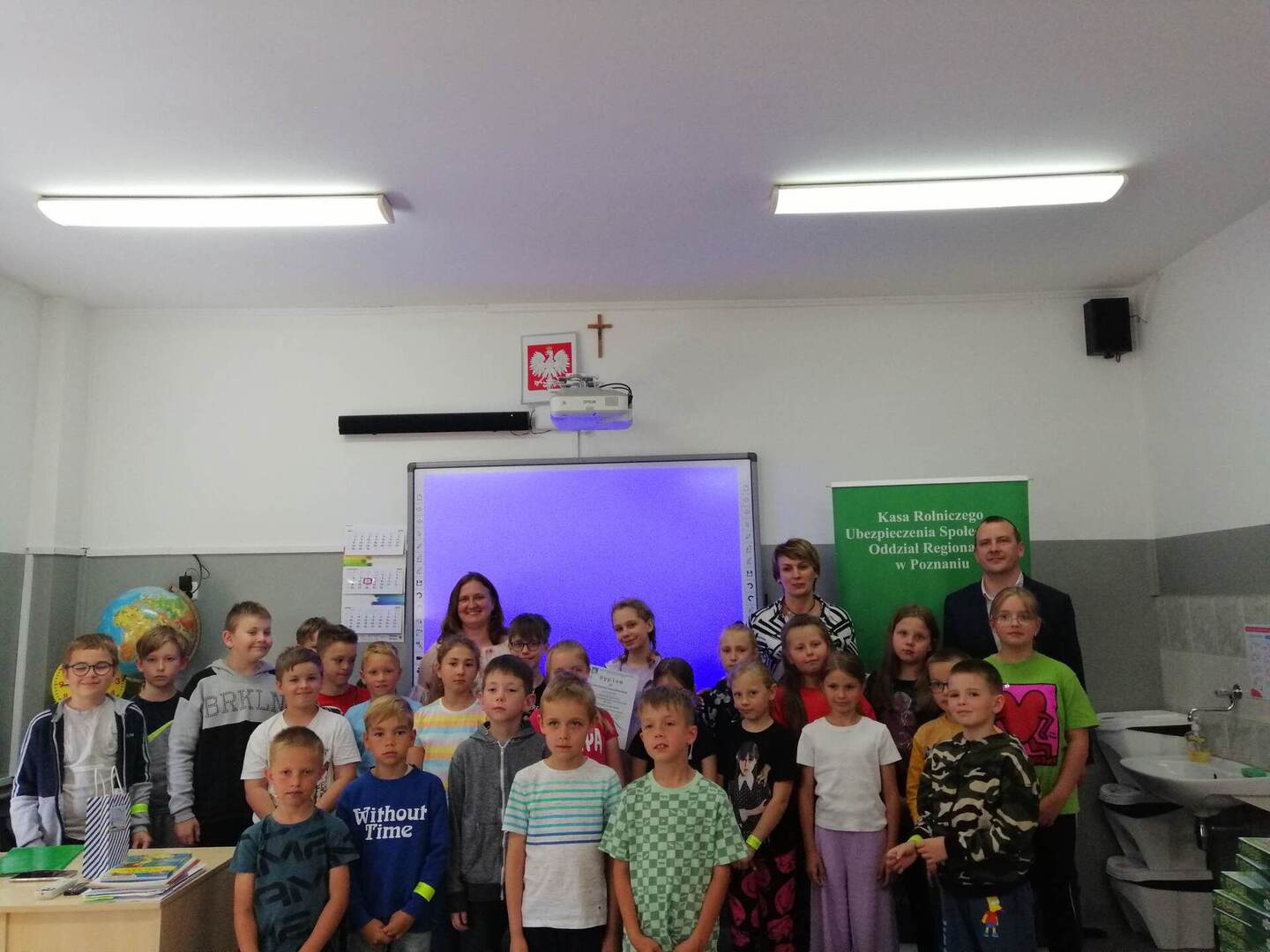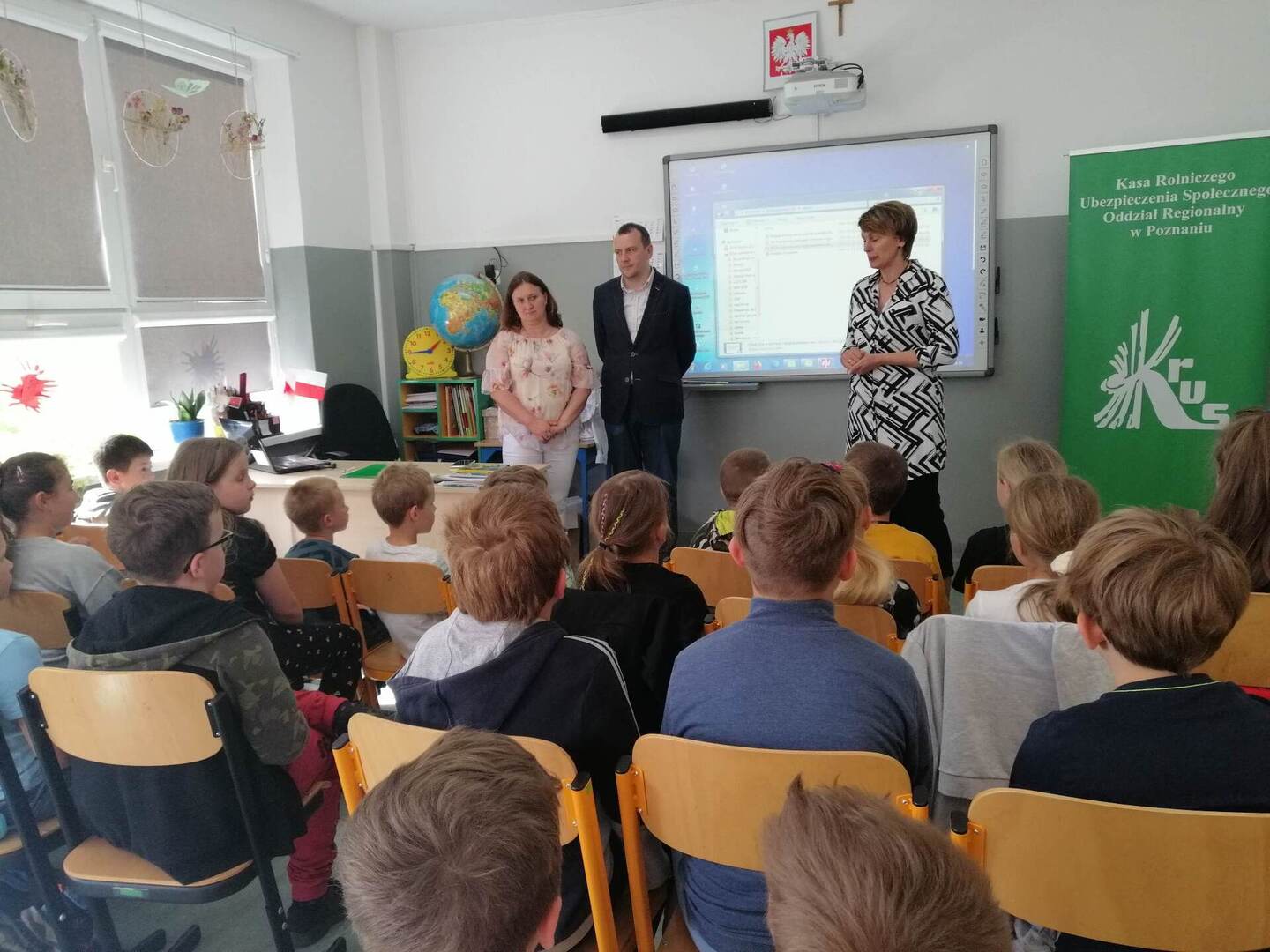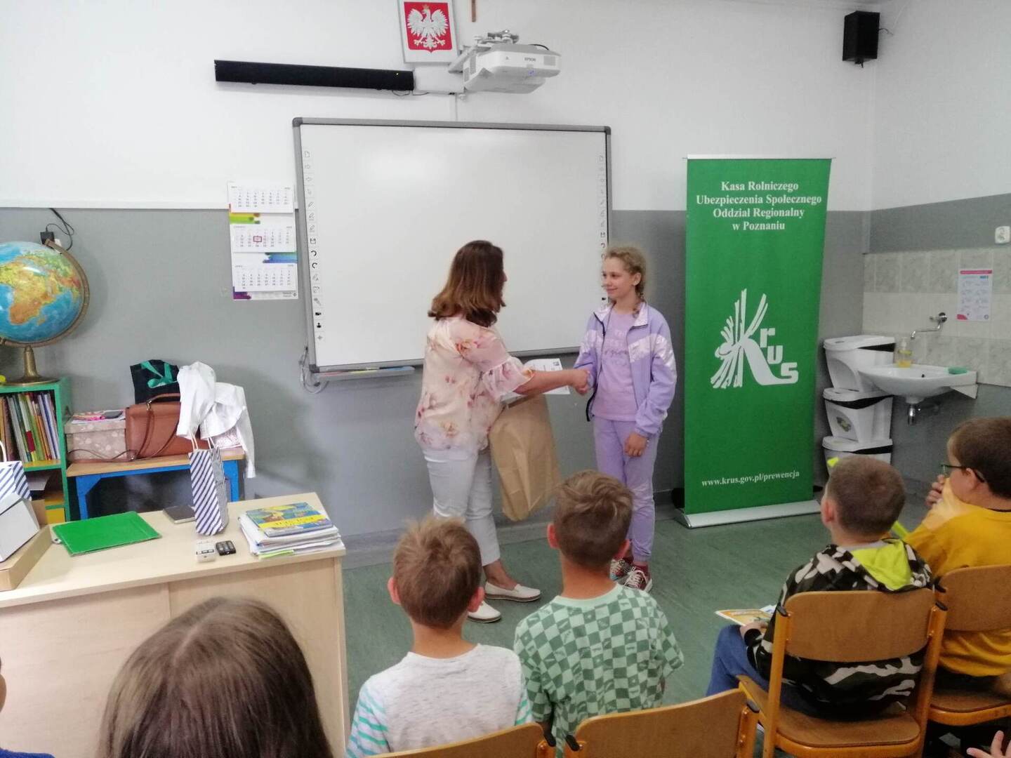 W dniu dzisiejszym w ciekawy sposób uczniowie klas I-III utrwalili sobie zasady bezpieczeństwa podczas pracy w gospodarstwie rolnym. Niektóre informacje zaskoczyły naszych podopiecznych, jednak uczymy się przez całe życie.. Dzieci otrzymały również wiele fantastycznych prezentów, które mają pomóc utrwalić zdobyte umiejętności i wiadomości. Podczas wizyty przedstawicieli urzędu wręczono Aleksandrze Lewandowskiej wyróżnienie za udział w konkursie plastycznym organizowanym przez tą instytucje.