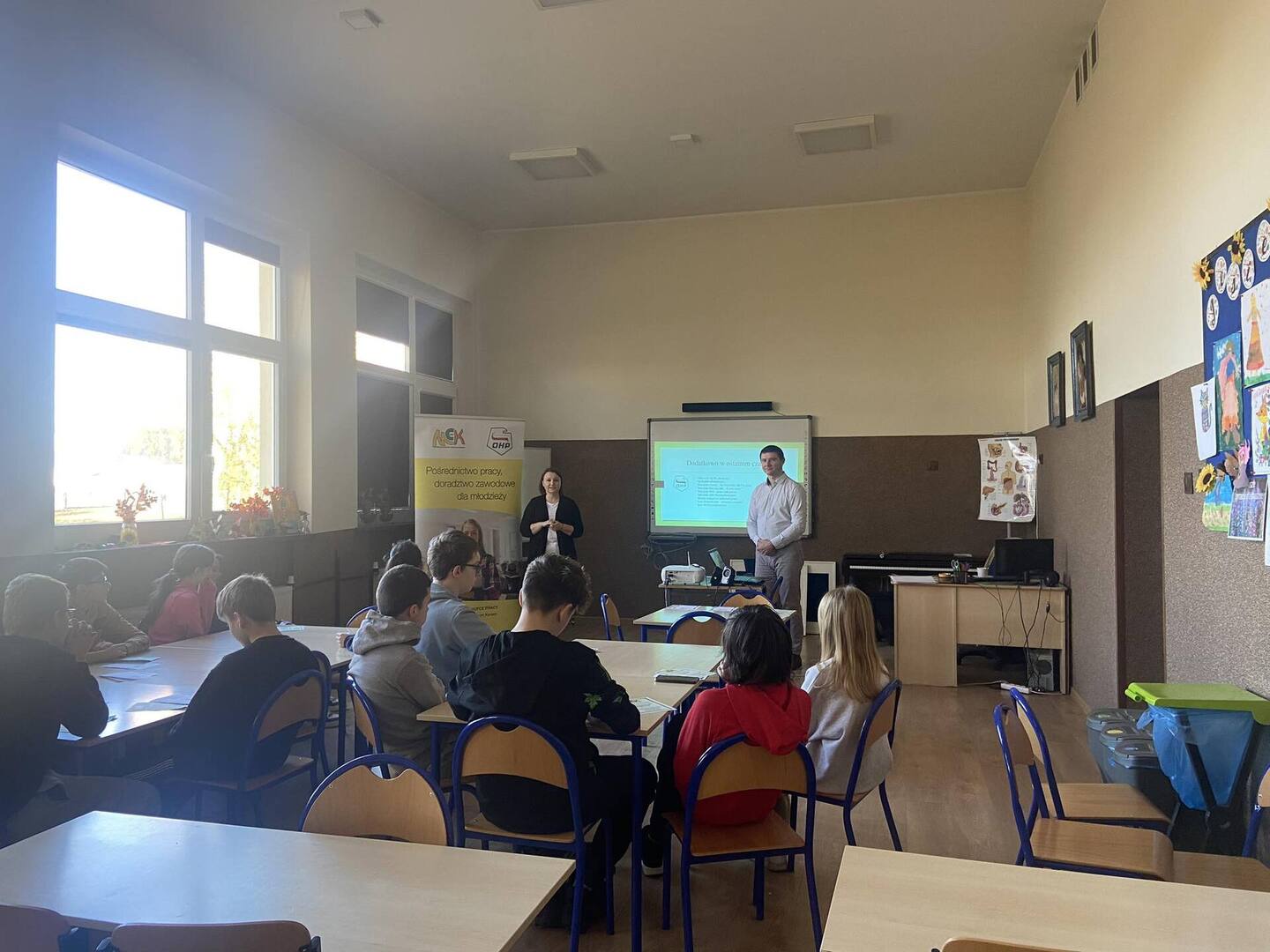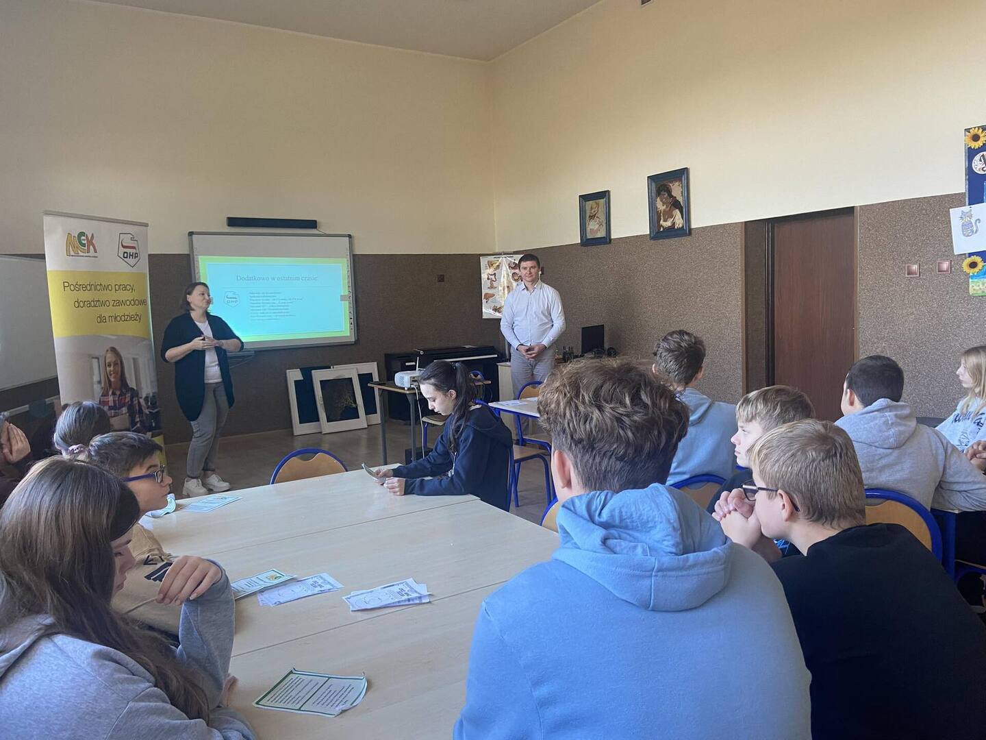 Dnia 22 listopada br. odbyło się spotkanie z przedstawicielami Młodzieżowego Centrum Kariery w Słupcy. Pani Wioletta Hoffman – doradca zawodowy oraz pan Marcin Nowak – pośrednik pracy zapoznali uczniów klasy siódmej i ósmej z możliwościami i zasobami oferowanymi przez MCK. Młodzież naszej szkoły skorzystała z informacji dotyczącej różnych ścieżek kariery zawodowej oraz form edukacyjnych dostępnych w naszym regionie. Uczniowie poznali swoje mocne strony i skłonności zawodowe.