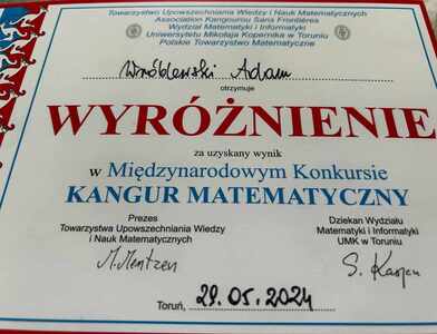 Wyróżnienie w konkursie matematycznym Kangur