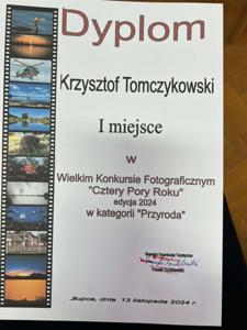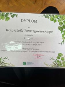 Krzysztof Tomczykowski z kl V zdobył I miejsce w kategorii Przyroda oraz II miejsce - Nagroda Specjalna Zespołu Parków Krajobrazowych Województwa Wielkopolskiego.