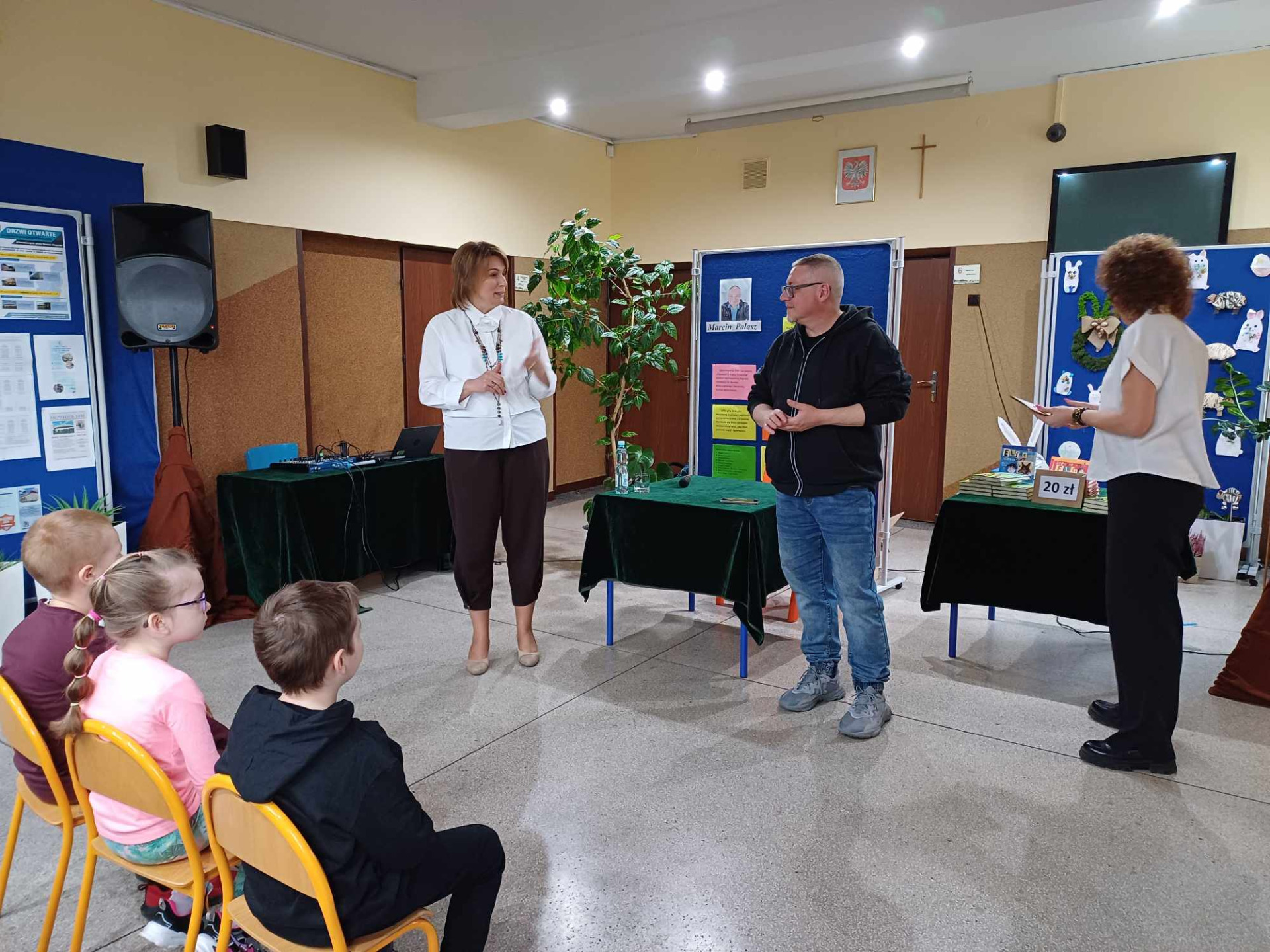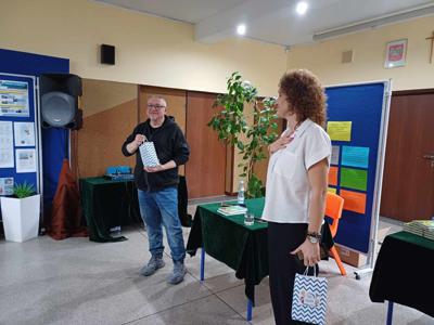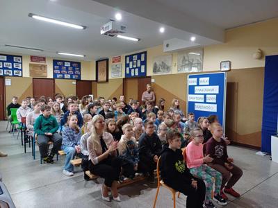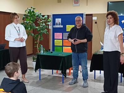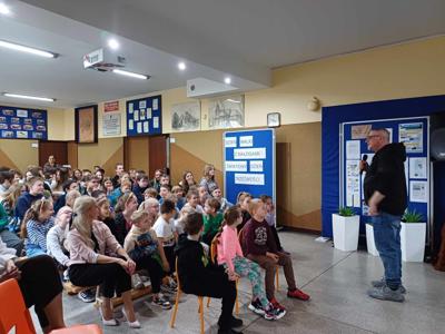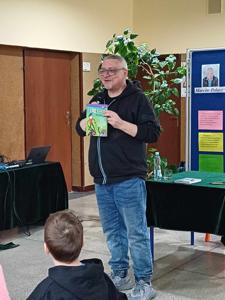 W poniedziałek, 14 kwietnia, w naszej szkole odbyło się spotkanie z pisarzem - p. Marcinem Pałaszem, autorem książek dla dzieci i młodzieży, twórcą słuchowisk radiowych. Rozgłos i sławę przyniosła mu seria książek, której bohaterem jest jego pies Elf. Pisarz, w bardzo zabawny sposób, opowiadał anegdoty ze swojego życia. Można też było kupić książkę z dedykacją.