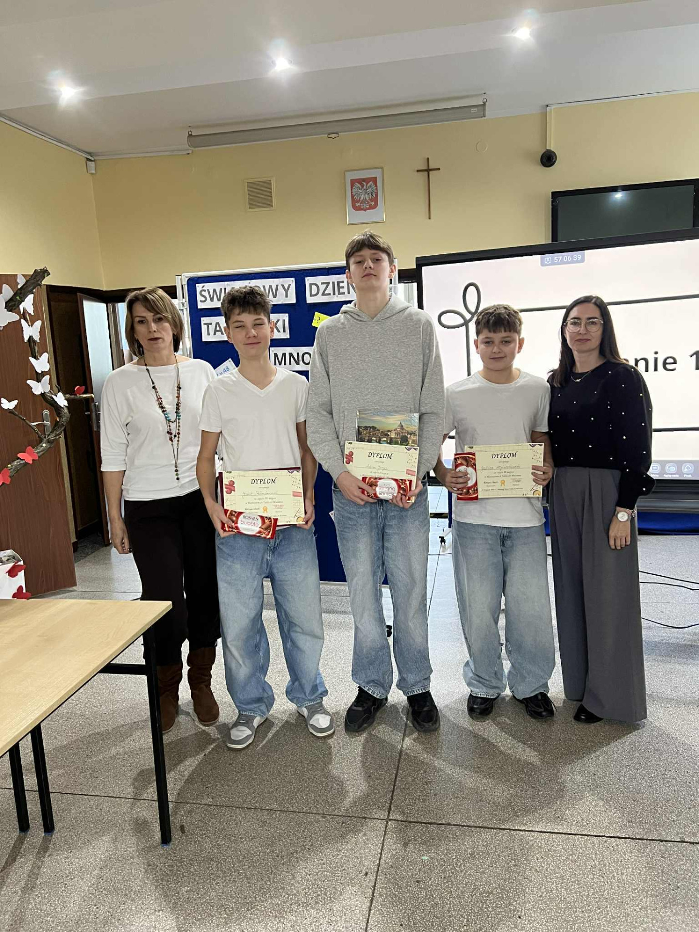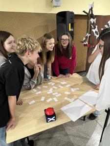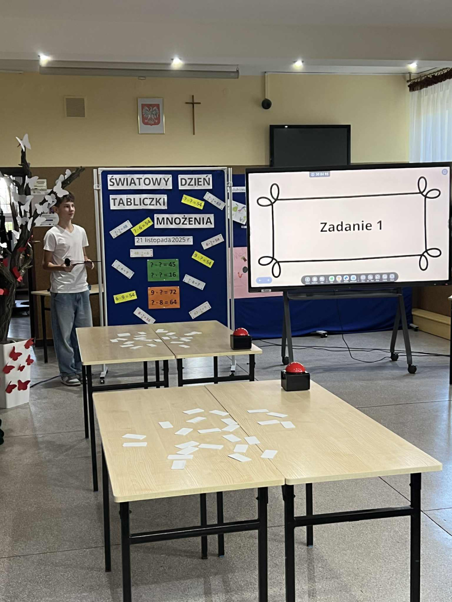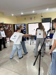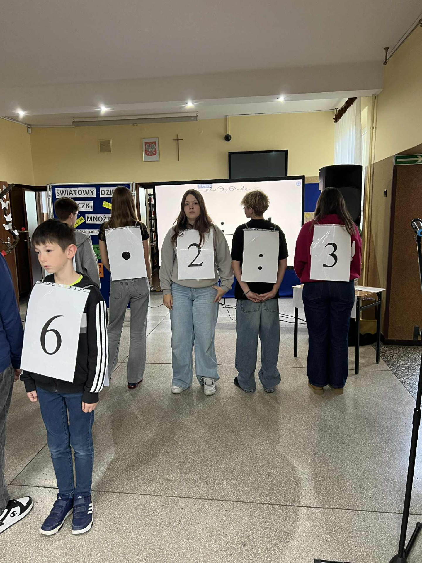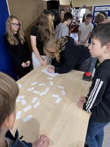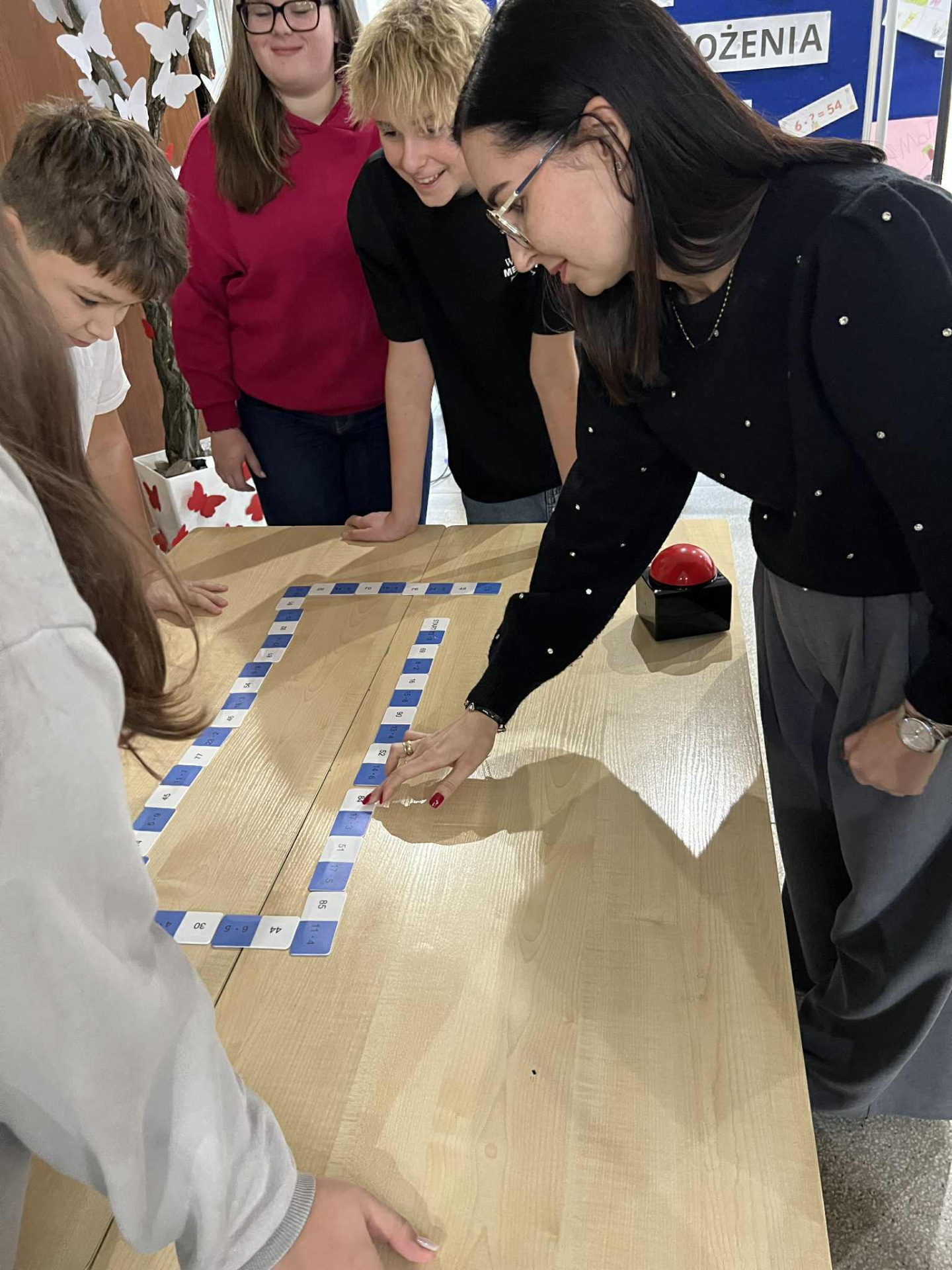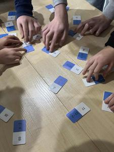 Następnie odbył się Tabliczkowy Turniej, do którego zgłosili się chętni uczniowie. Zawodnicy podzieleni zostali na dwie drużyny i sami wybrali swoje nazwy: Iloczyny i Wściekłe Chomiki. Uczniowie rywalizowali w trzech konkurencjach: układaniu matematycznego domina, turnieju „kto pierwszy, ten lepszy” oraz zabawie w układanie działania do podanego wyniku. Na sali panowała fantastyczna atmosfera – było mnóstwo śmiechu, emocji i matematycznych wyzwań! Po wyrównanej walce zwyciężyła drużyna Iloczynów! To była naprawdę ciekawa, pełna pozytywnych wrażeń lekcja matematyki. Dziękujemy wszystkim za udział i gratulujemy odwagi oraz zapału do ćwiczenia tabliczki mnożenia!