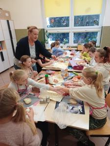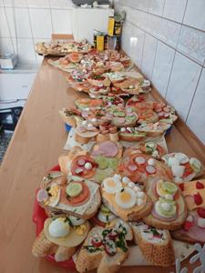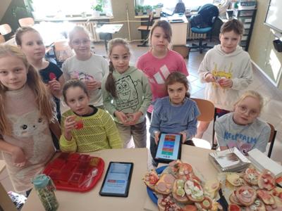 Wszystkie przygotowane przekąski miały jeden cel: podzielenie się nimi z całą społecznością szkolną. Uczniowie nie tylko przygotowali i dekorowali, lecz również uczyli się współpracy, planowania i odpowiedzialności za wspólne zadania. Do wspólnej zabawy zaprosiliśmy także przedszkolaków, którzy z zaangażowaniem rozwiązywali dostosowane do nich zadania matematyczne a następnie z zachwytem kosztowali przygotowane dla nich niespodzianki.