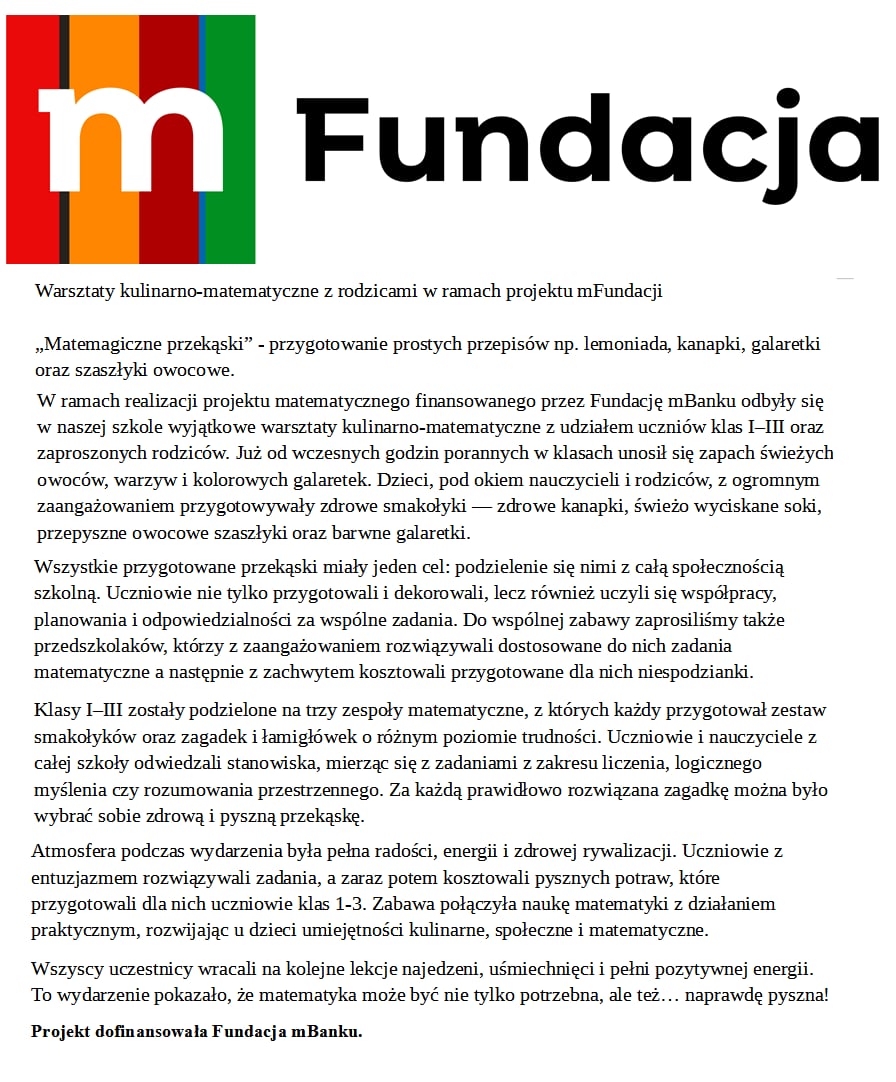 W ramach realizacji projektu matematycznego finansowanego przez Fundację mBanku odbyły się w naszej szkole wyjątkowe warsztaty kulinarno-matematyczne z udziałem uczniów klas I–III oraz zaproszonych rodziców. Już od wczesnych godzin porannych w klasach unosił się zapach świeżych owoców, warzyw i kolorowych galaretek. Dzieci, pod okiem nauczycieli i rodziców, z ogromnym zaangażowaniem przygotowywały zdrowe smakołyki — zdrowe kanapki, świeżo wyciskane soki, przepyszne owocowe szaszłyki oraz barwne galaretki.