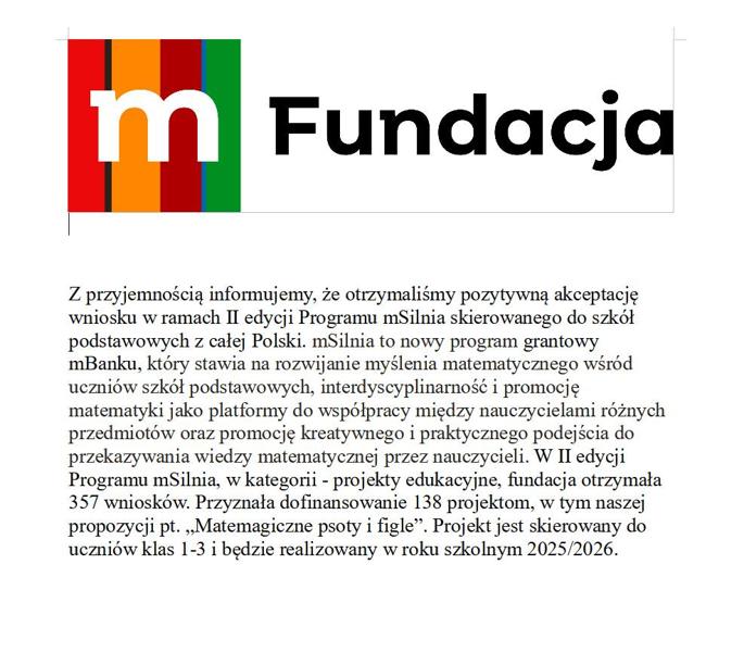 17 września 2025 Aktualności II edycja Programu mSilnia Z przyjemnością informujemy, że otrzymaliśmy pozytywną akceptację wniosku w ramach II edycji Programu mSilnia skierowanego do szkół podstawowych z całej Polski. mSilnia to nowy program grantowy... Czytaj więcej