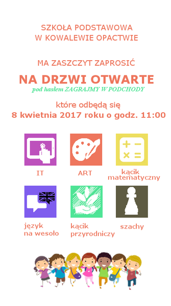 05 kwietnia 2017 Aktualności Ruszyła rekrutacja na rok szkolny 2017/2018 Szkoła podstawowa w Kowalewie Opactwie ma zaszczyt zaprosić Rodziców wraz z Dziećmi na DRZWI OTWARTE. Spotkanie odbędzie się 8 kwietnia 2017 roku o godzinie 11:00 w siedzibie obecnego gimnazjum.... Czytaj więcej