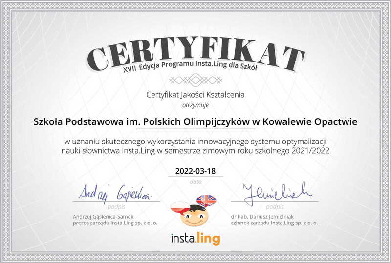 24 marca 2022 Aktualności Certyfikat Jakości Kształcenia Certyfikaty dla szkół za XVII edycję w programie Instaling zostały wystawione, dlatego chcielibyśmy serdecznie pogratulować wszystkim Uczniom, którzy aktywnie zaangażowali się w pracę z Programem.... Czytaj więcej